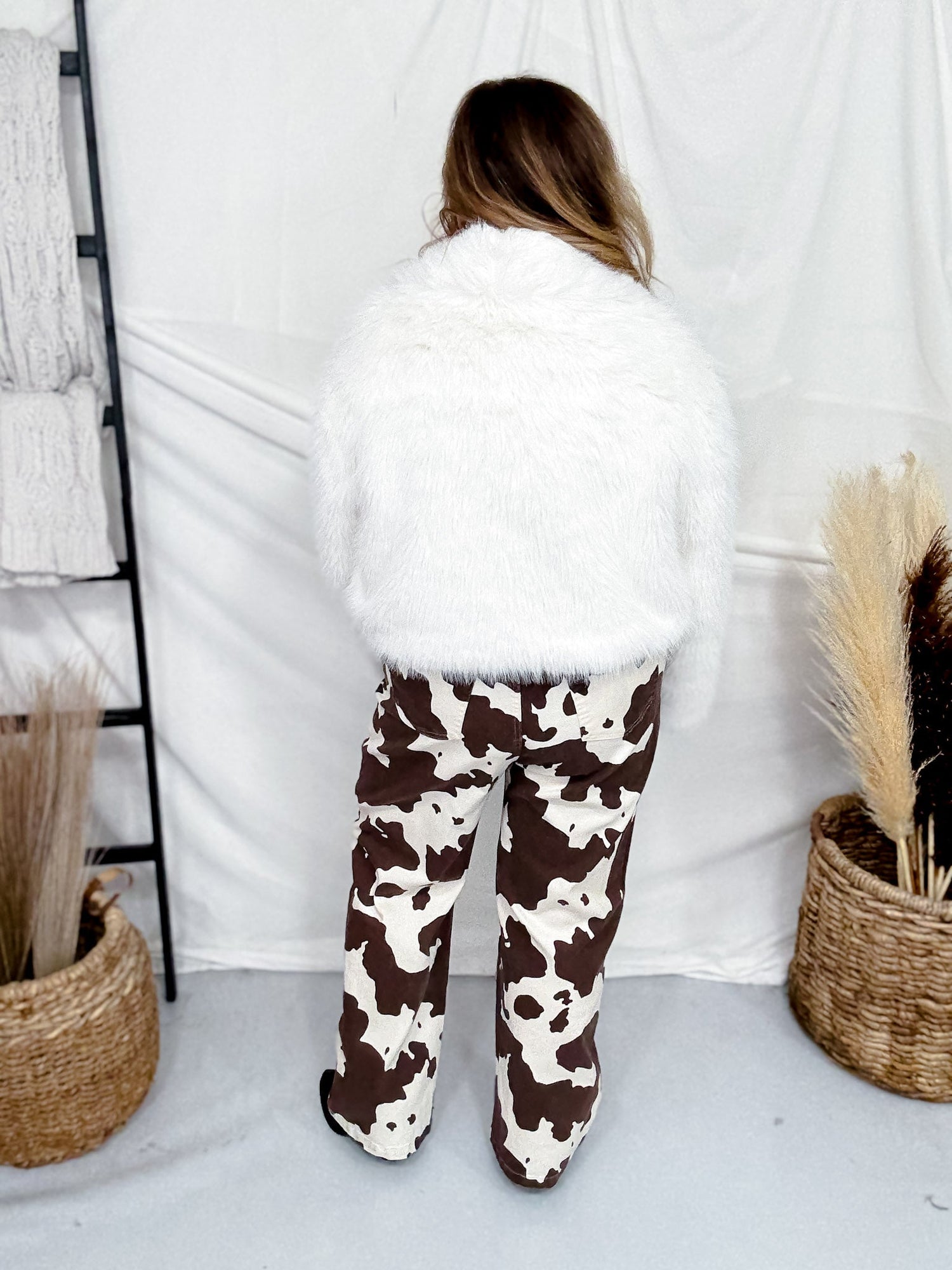 Slip into softness with this ivory faux fur open front jacket, featuring a single hook closure for just the right touch of ease and flair. Its plush texture and light hue make it a playful yet elegant addition to brighten up any chilly day!