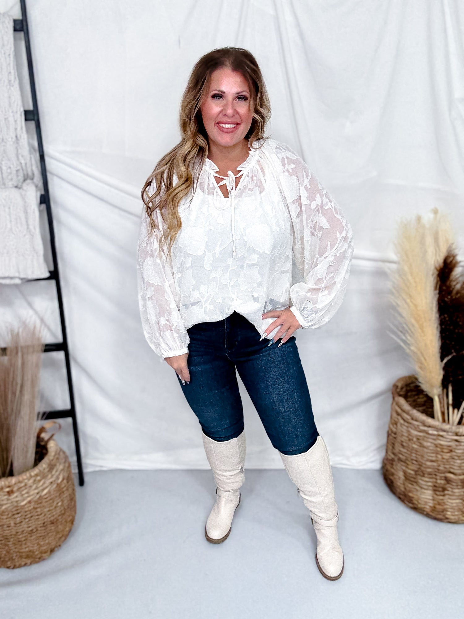Elevate your style with this Ivory Floral Jacquard Sheer Blouse, featuring delicate sheer fabric adorned with elegant floral jacquard patterns. The tie neckline and voluminous balloon sleeves add a touch of whimsy, making it perfect for both casual days and dressy occasions.