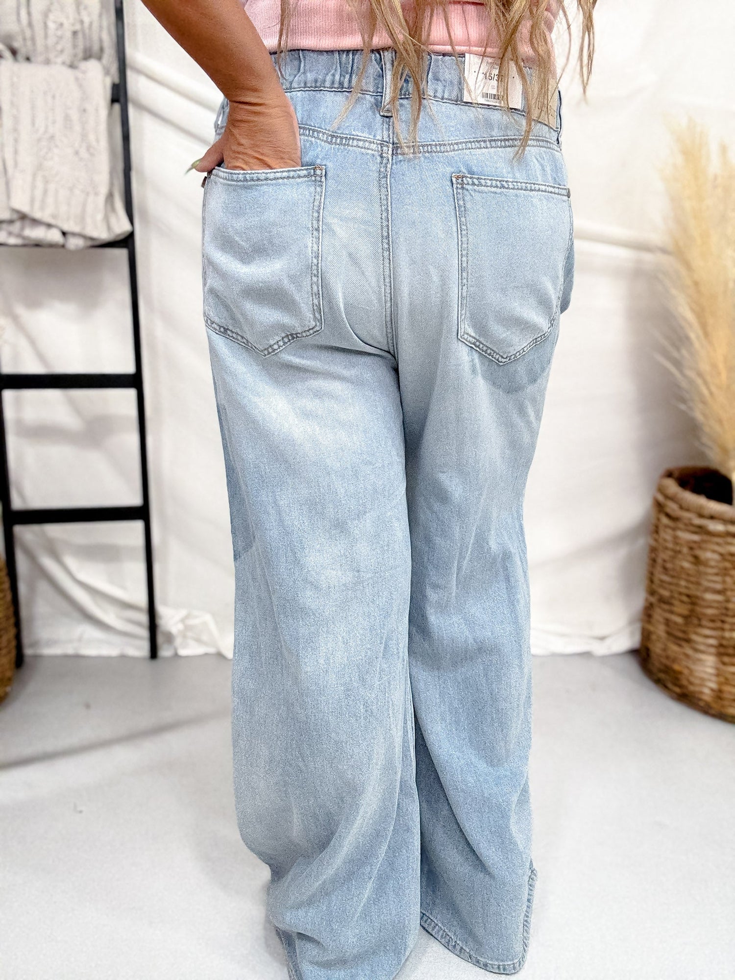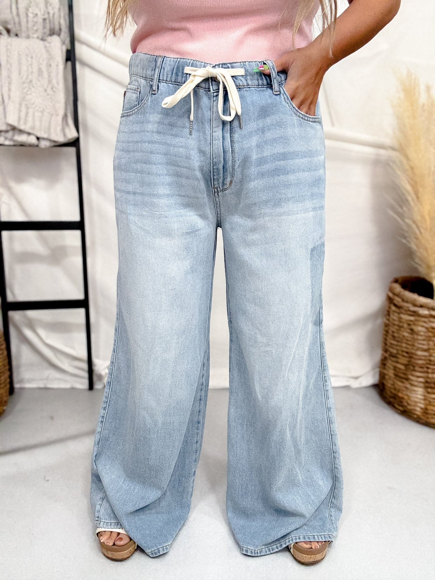 Slip into pure comfort with these Judy Blue palazzo jeans that feel as soft as your favorite bedsheets. The high-waist cut flatters your silhouette while the elastic waistband and drawstring keep everything perfectly in place. Crafted from innovative tencel PFD fabric, these featherweight jeans move with you throughout the day. The light wash pairs beautifully with shadow pockets for a polished look that doesn't sacrifice comfort. Who knew looking effortlessly chic could feel this good?