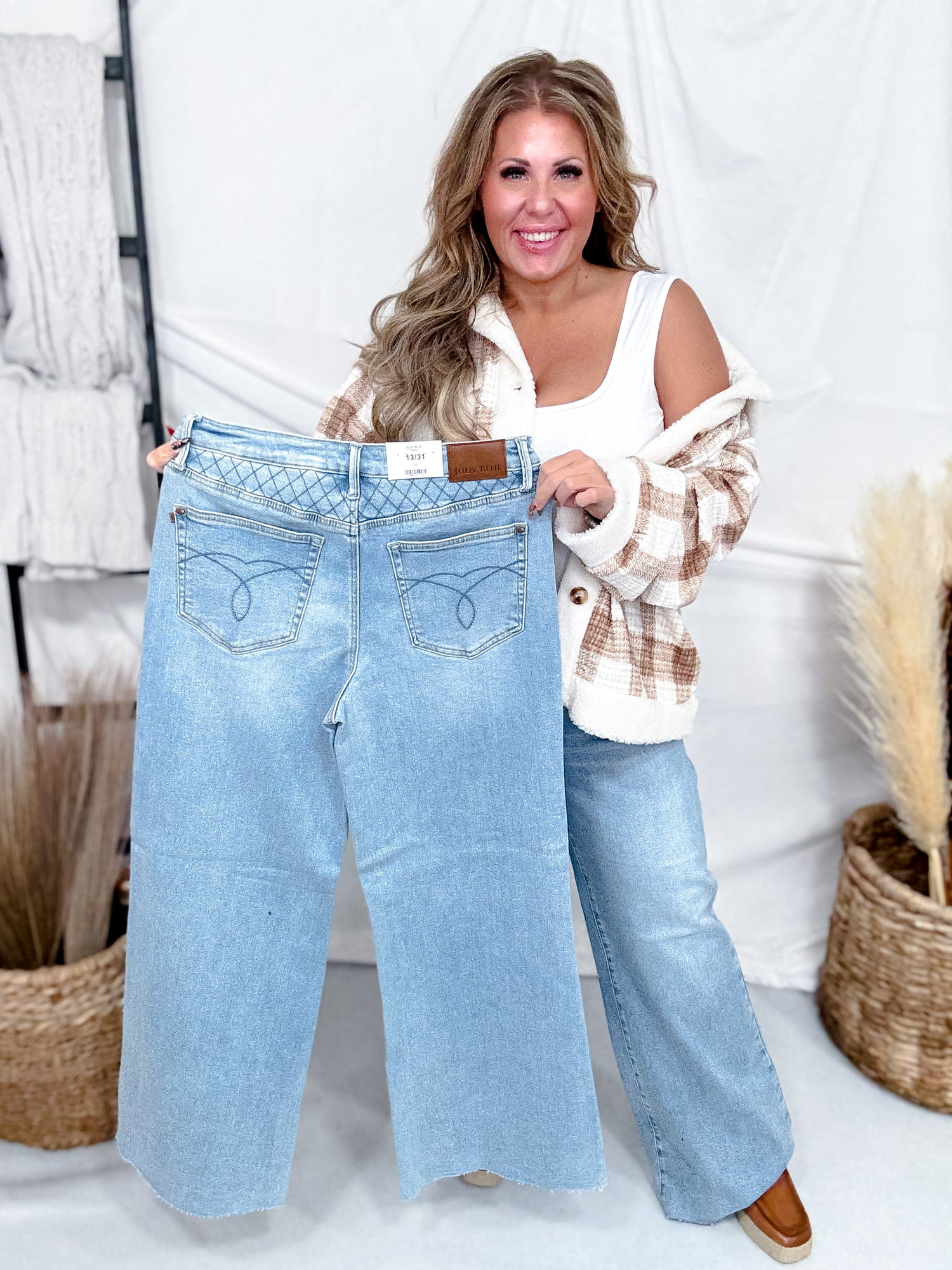 Step into retro vibes with these Judy Blue high-waist wide-leg jeans! The light blue wash gives off effortless cool, while the signature quilt-style stitching across the waist adds a fun, vintage-inspired detail. Perfect for channeling that '90s nostalgia with a modern twist.