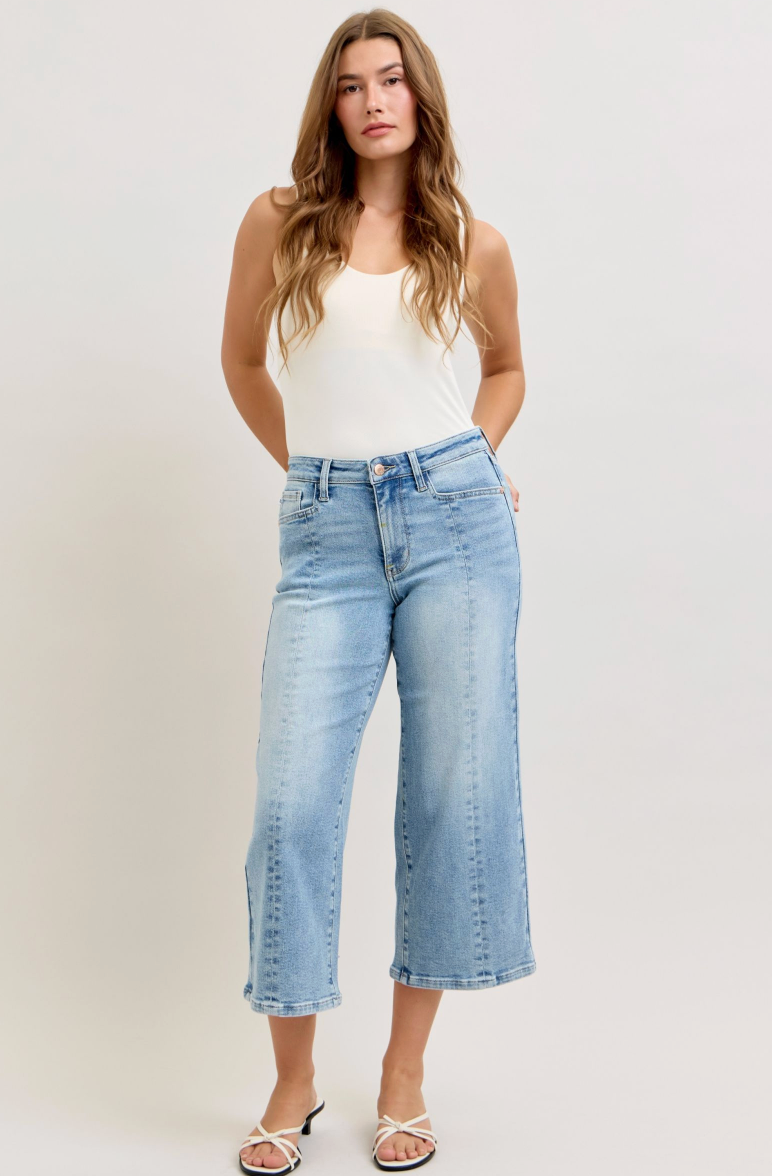Adorable light wash Judy Blue mid-rise wide leg crop vintage pocket jeans with center front seam detail that adds instant character. These effortlessly cool jeans hit right at the ankle, creating the perfect silhouette for pairing with sneakers, boots, or sandals. The relaxed wide-leg cut offers comfortable movement without sacrificing style, while the mid-rise waistband sits just right for all-day wear. Vintage-inspired pockets give you that nostalgic vibe, and the light wash keeps things fresh and versatile. Whether you're dressing them up or keeping it casual, these jeans are your new go-to for looking put-together with zero effort.