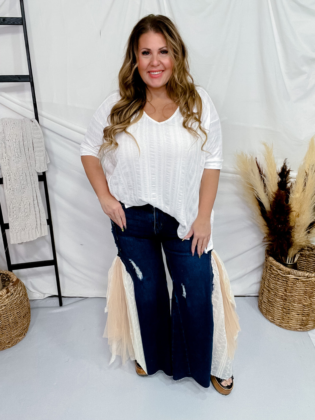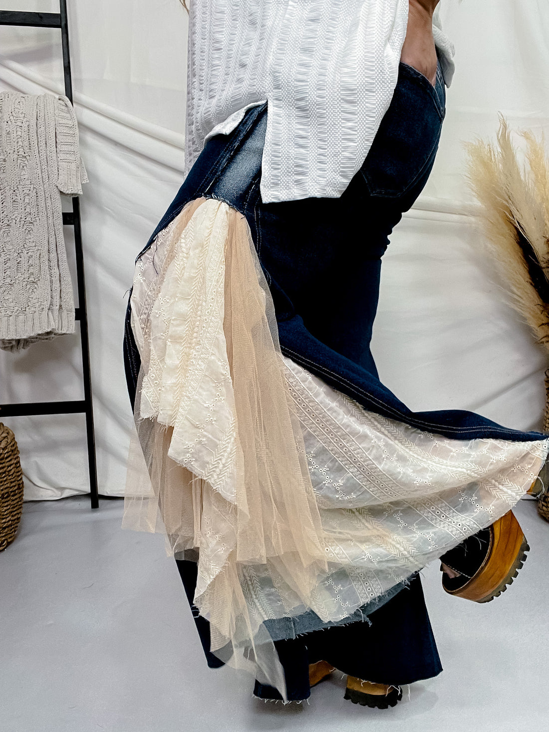 These stylish dark denim flares feature intricate lace and mesh insets, ensuring that your outfit will turn heads no matter where you go. Show off your unique sense of style with these statement-making jeans!