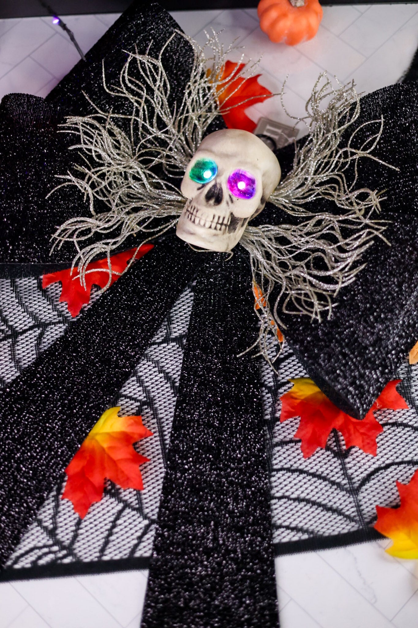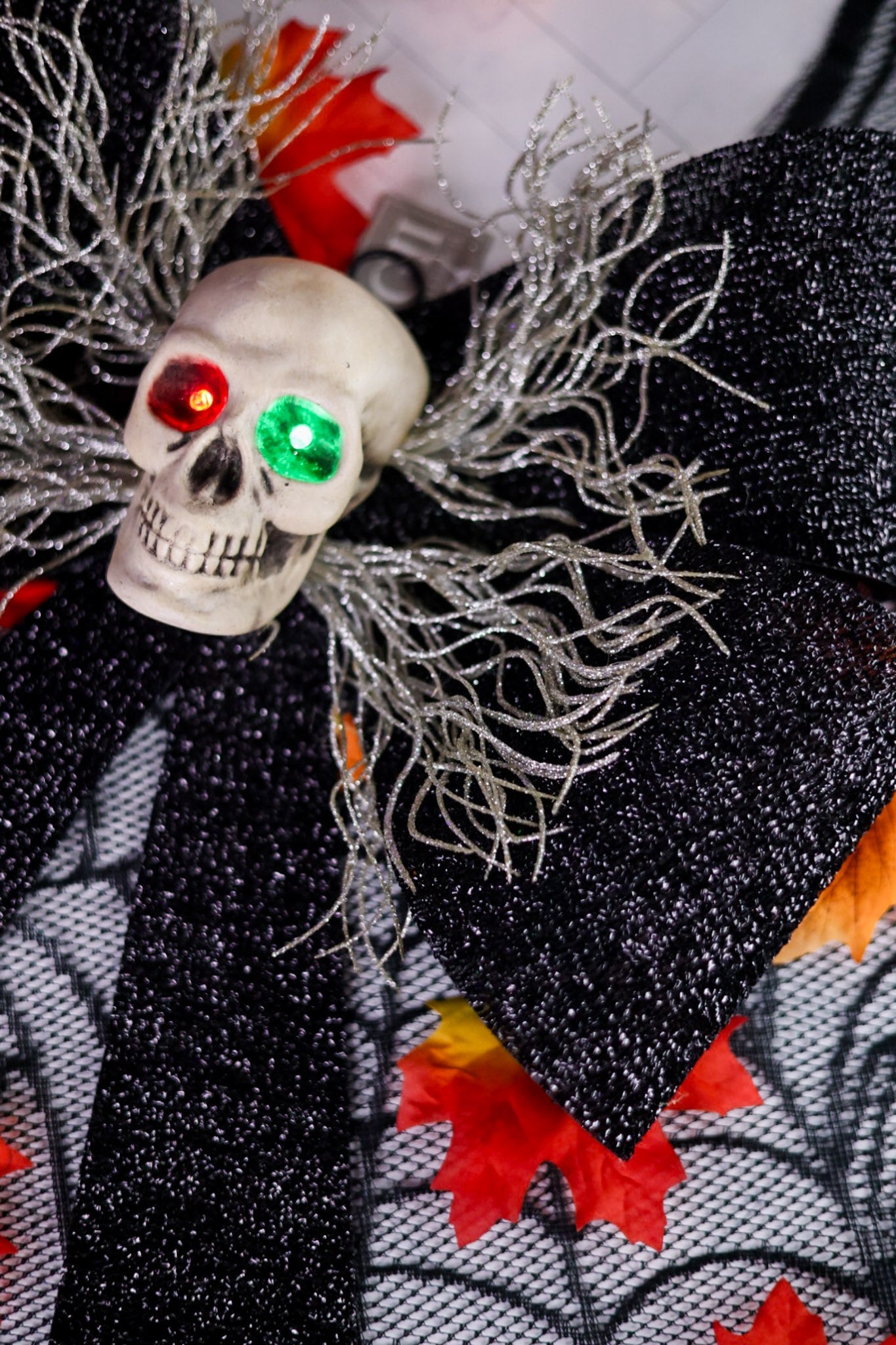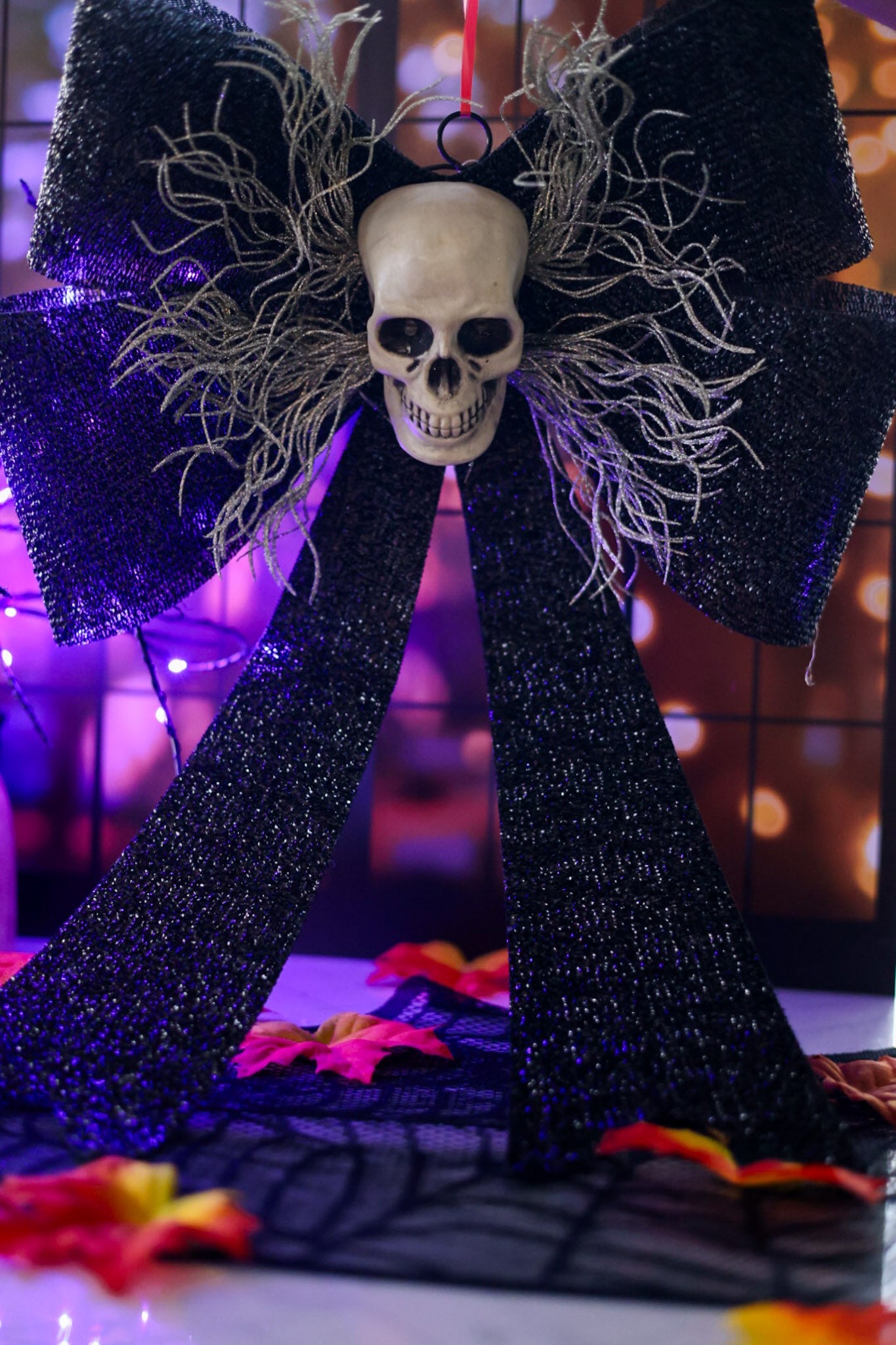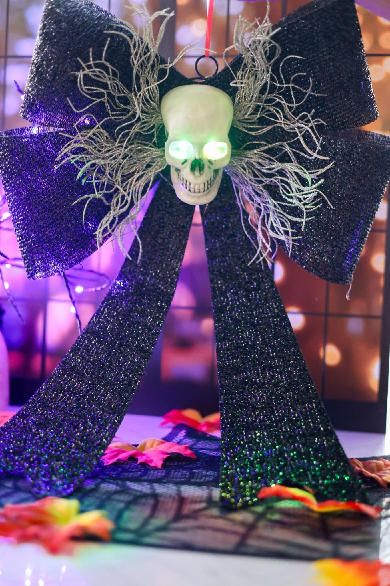 Give your door a fun and spooky makeover with the LED Skull Bow Door Hanger. This unique decoration features a black textured bow paired with a skull that has glowing light-up eyes, adding a playful and eerie vibe to any entryway. Perfect for Halloween or anytime you want to add a touch of mischievous charm to your home.
