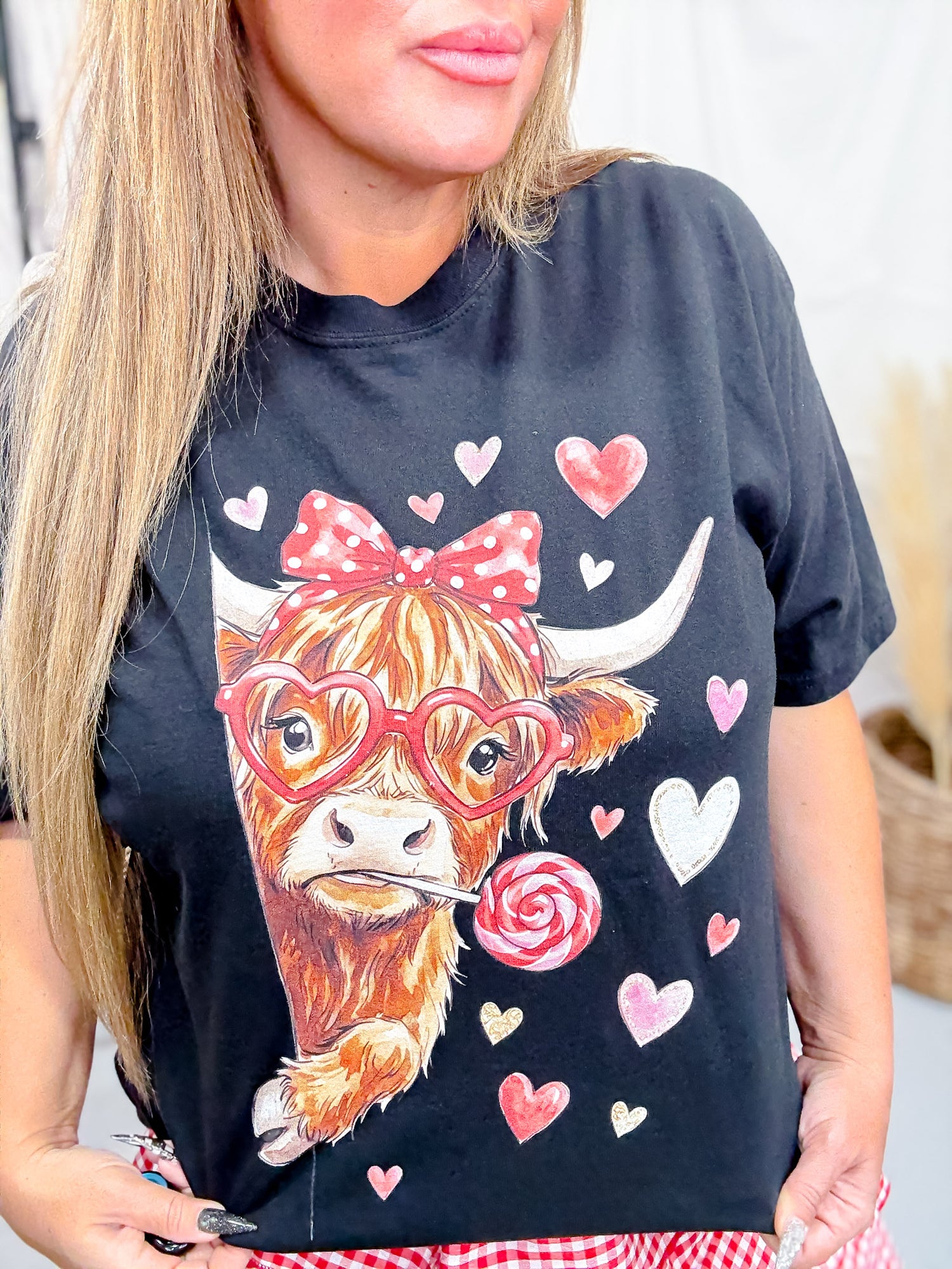 This charming short sleeve graphic tee features an adorable highland cow with a pink lollipop, surrounded by sweet heart accents. Perfect for adding a touch of sweetness to your Valentine's wardrobe! Soft, comfortable, and conversation-starting—because life's too short for ordinary tees.