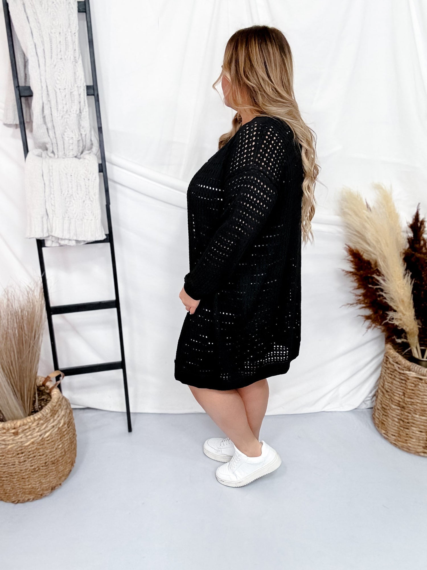 Unleash your fashion daring with this essential piece! The adaptable black cardigan is ideal for seamlessly adding layers and staying cozy from sunrise to sunset.