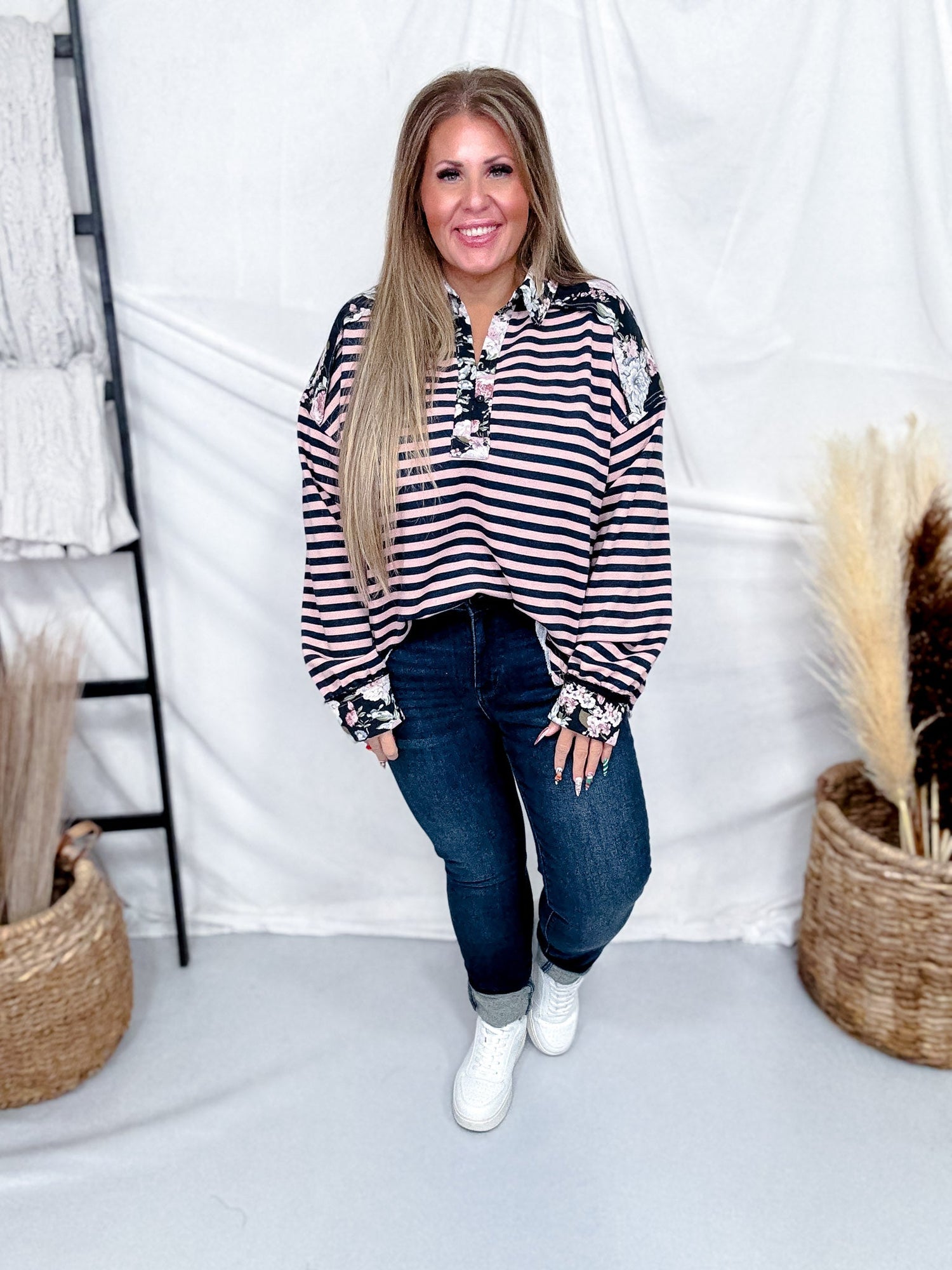 Bring charm and versatility to your boutique with this striped floral contrast pullover. Designed with a soft drape, split neckline, and floral collar accents, it blends casual comfort with feminine detail. The relaxed silhouette and mixed print styling make it an elevated everyday piece that pairs effortlessly with denim or tailored bottoms, ensuring timeless appeal for boutique buyers seeking refined casual wear.