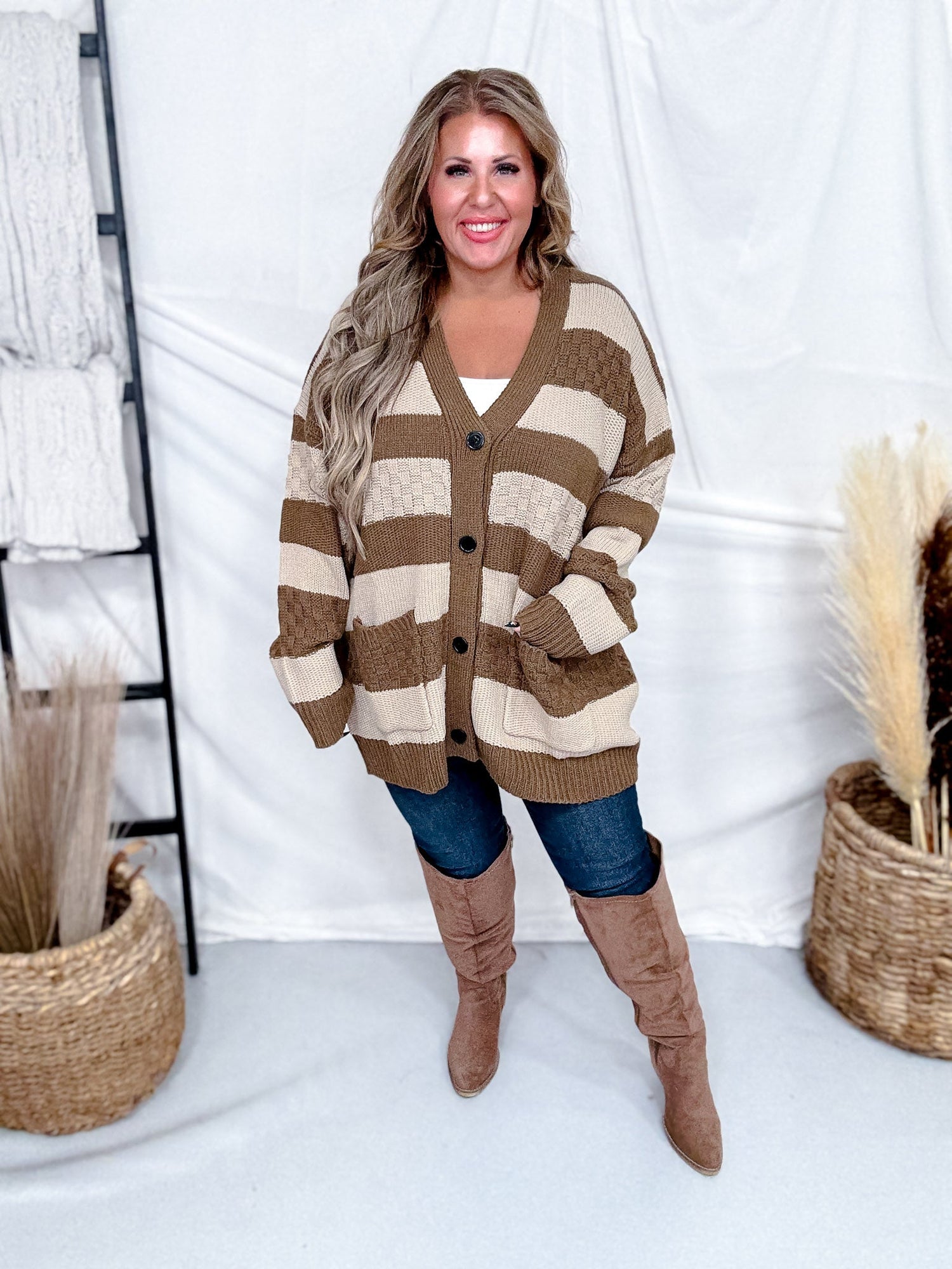 Elevate your layering game with this brown and taupe striped textured knit cardigan. Designed with bold horizontal stripes and a subtle check weave, it offers a modern twist on a cozy classic. The button-down front and relaxed fit make it versatile for pairing with denim, skirts, or wide-leg pants.