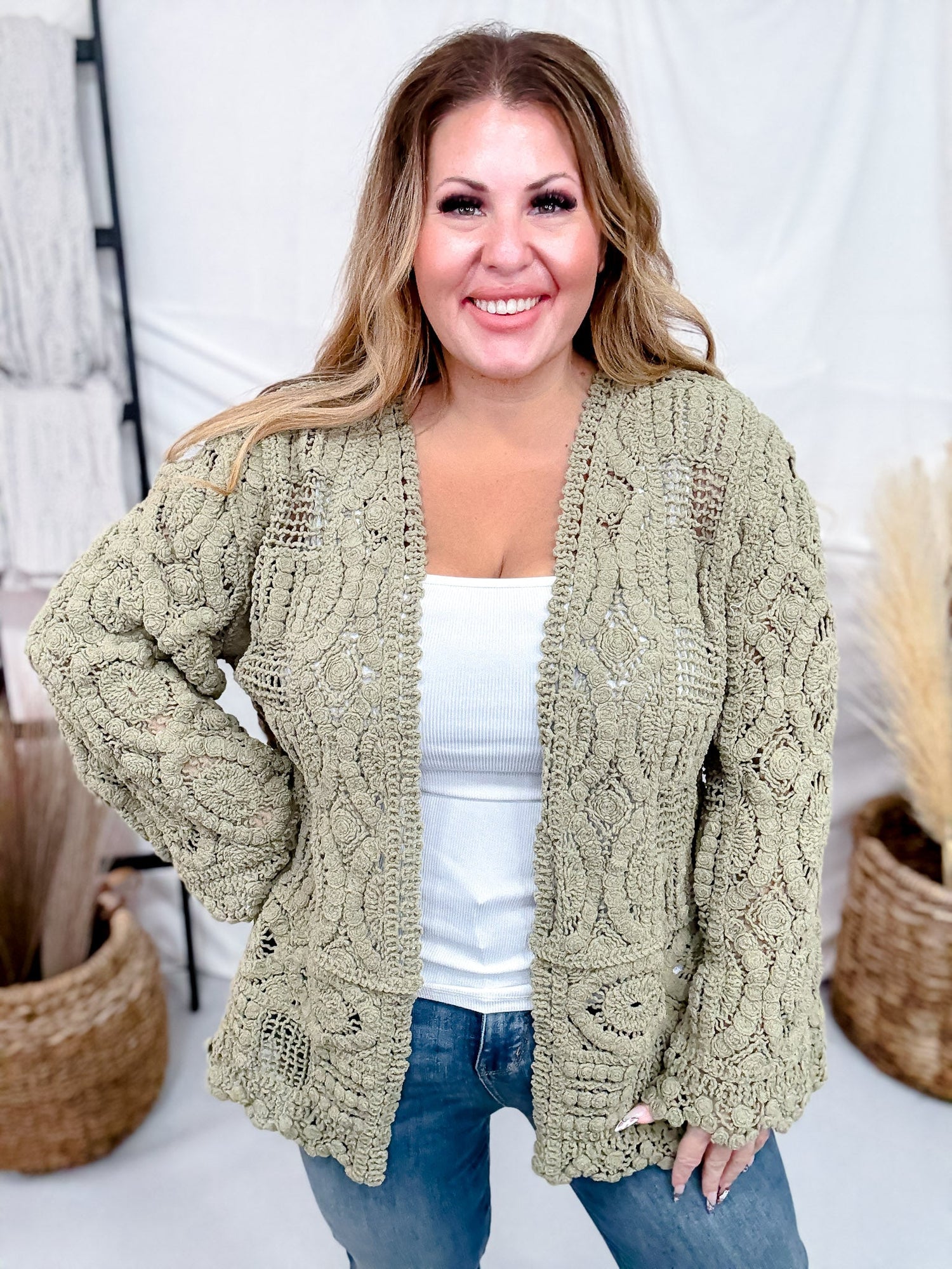Add a whimsical touch to your wardrobe with this vintage-inspired long sleeve olive green crochet open cardigan. Featuring delicate scalloped edges, it layers beautifully over your favorite tops for a cozy yet breezy look. Perfect for casual outings or adding a hint of retro charm, this cardigan embraces comfort and style in every stitch.