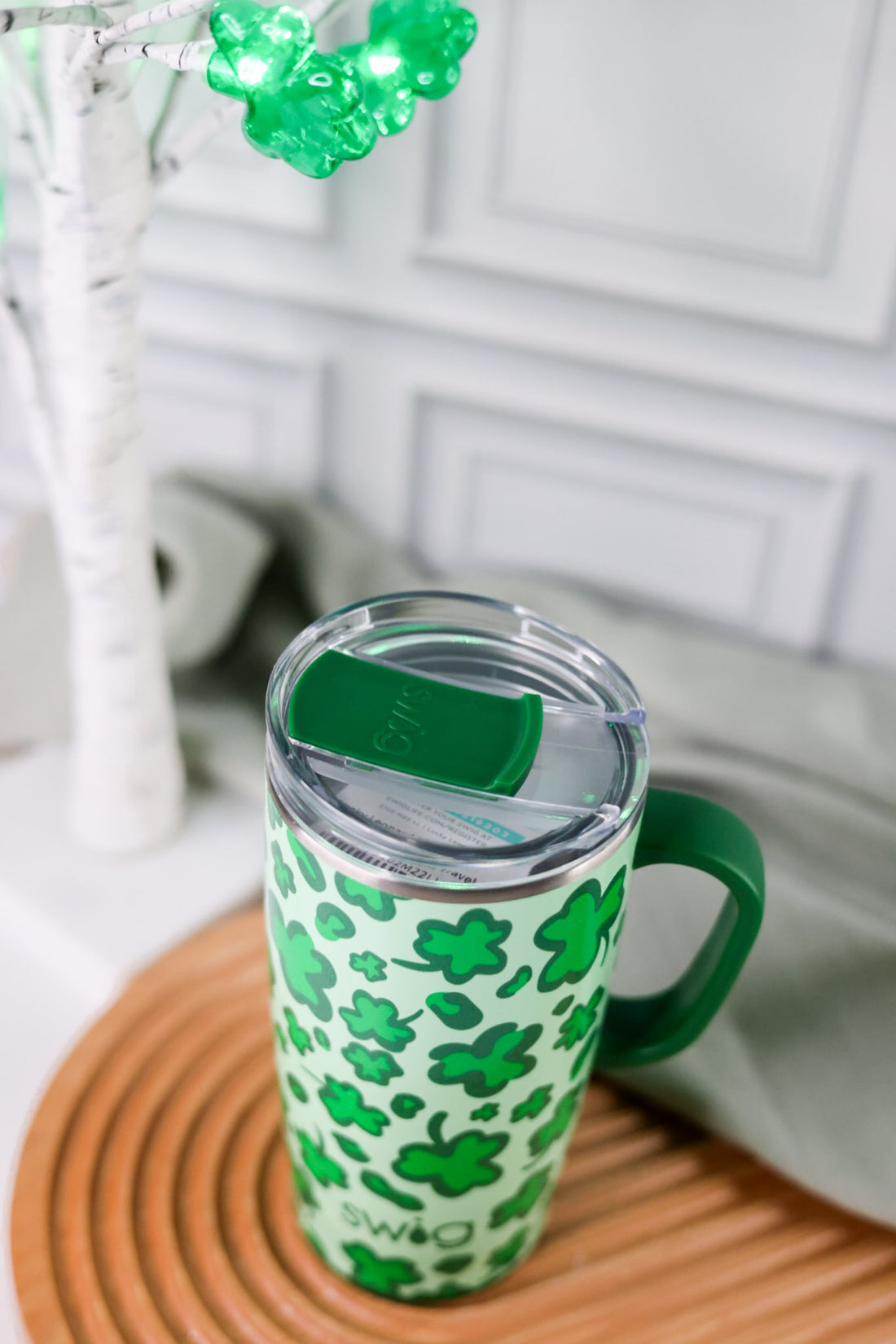 Sip in style with the Lucky Leopard 22oz Travel Mug, featuring a festive glittery green shamrock leopard print that's perfect for St. Patrick's Day celebrations. The insulated design keeps your drinks at the ideal temperature, while the cupholder-friendly shape fits seamlessly into your car or bag. Whether you're heading to the office or the parade, this playful mug brings a touch of lucky charm to every sip.