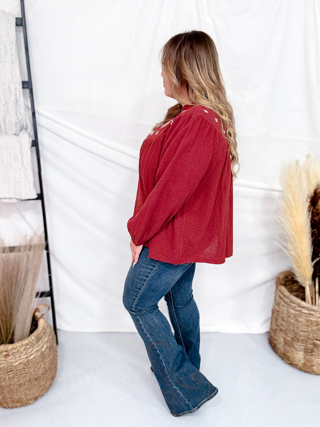 This mahogany long sleeve tunic brings the charm to your wardrobe with delicate embroidery along the chest and neckline. Its cozy fit and rich color make it an ideal go-to for turning everyday moments into stylish occasions. Easy to dress up or down, itβs your new favorite for effortless, fun fashion.