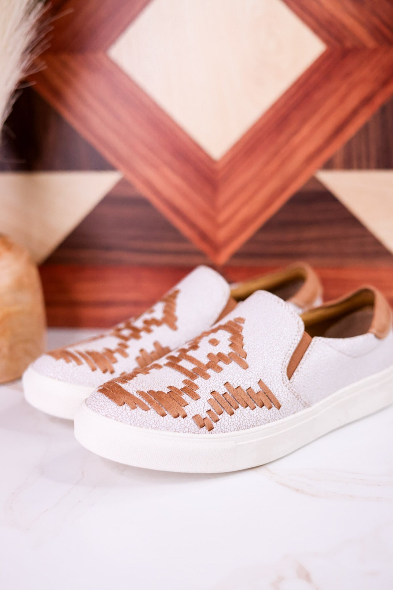 Step into effortless style with the Marian Tan Crackle Slip On Sneakers. Featuring a classic slip-on design, these sneakers showcase a unique tan crackle finish contrasted by a woven Aztec pattern. Perfect for adding a playful twist to any casual outfit, they combine comfort and eye-catching detail for easy, all-day wear.