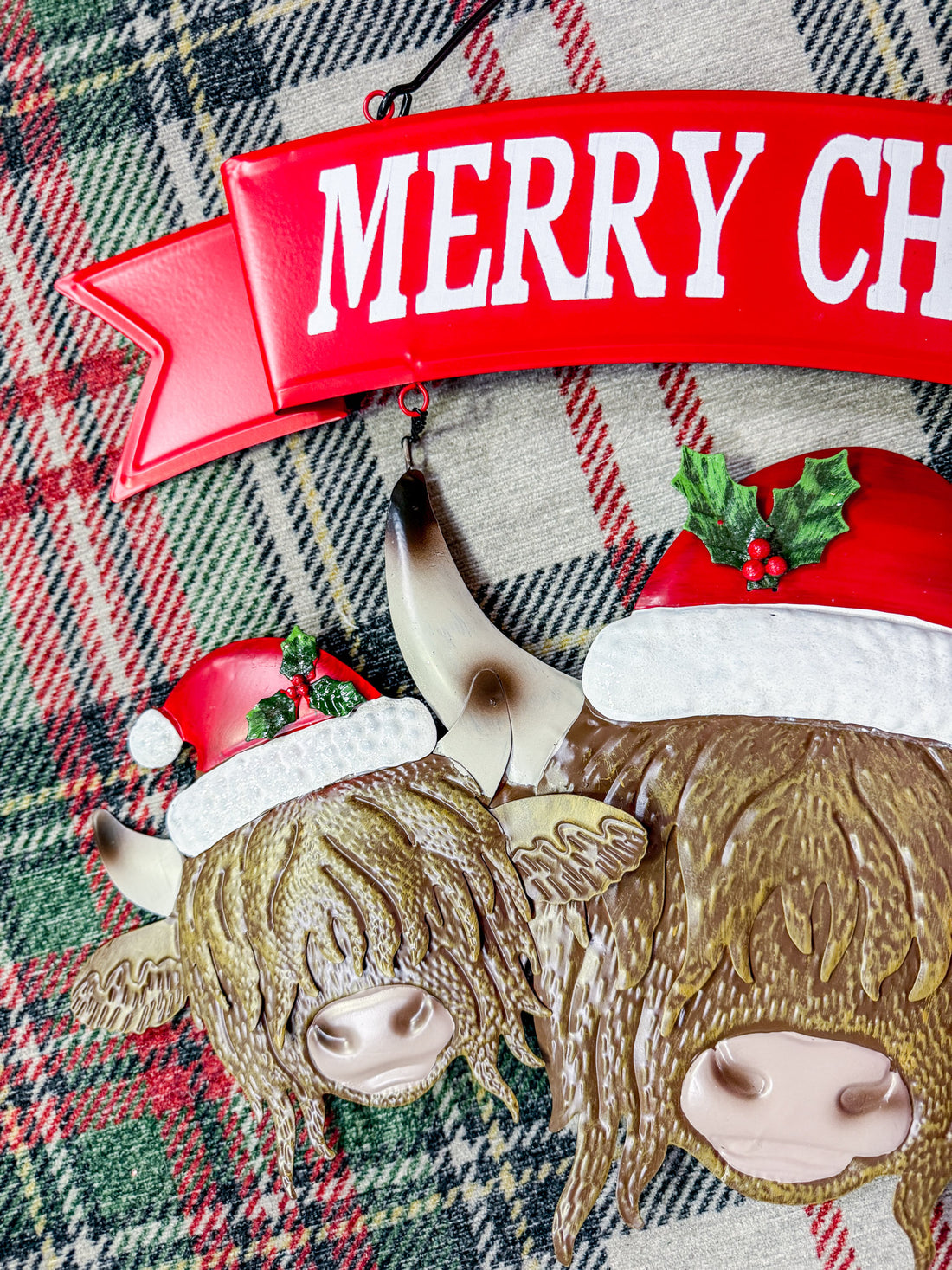 Celebrate the holiday season with a charming twist using this Metal Christmas Hanging Highland Cows Sign. Featuring two lovable highland cows decked out in festive gear, this sign brings warmth and whimsy to any space. Crafted from durable metal, it’s perfect for hanging on doors, walls, or mantels to spread merry cheer. Its playful design and cheerful "Merry Christmas" message make it a delightful addition to your holiday décor, sure to bring smiles and cozy vibes all season long.