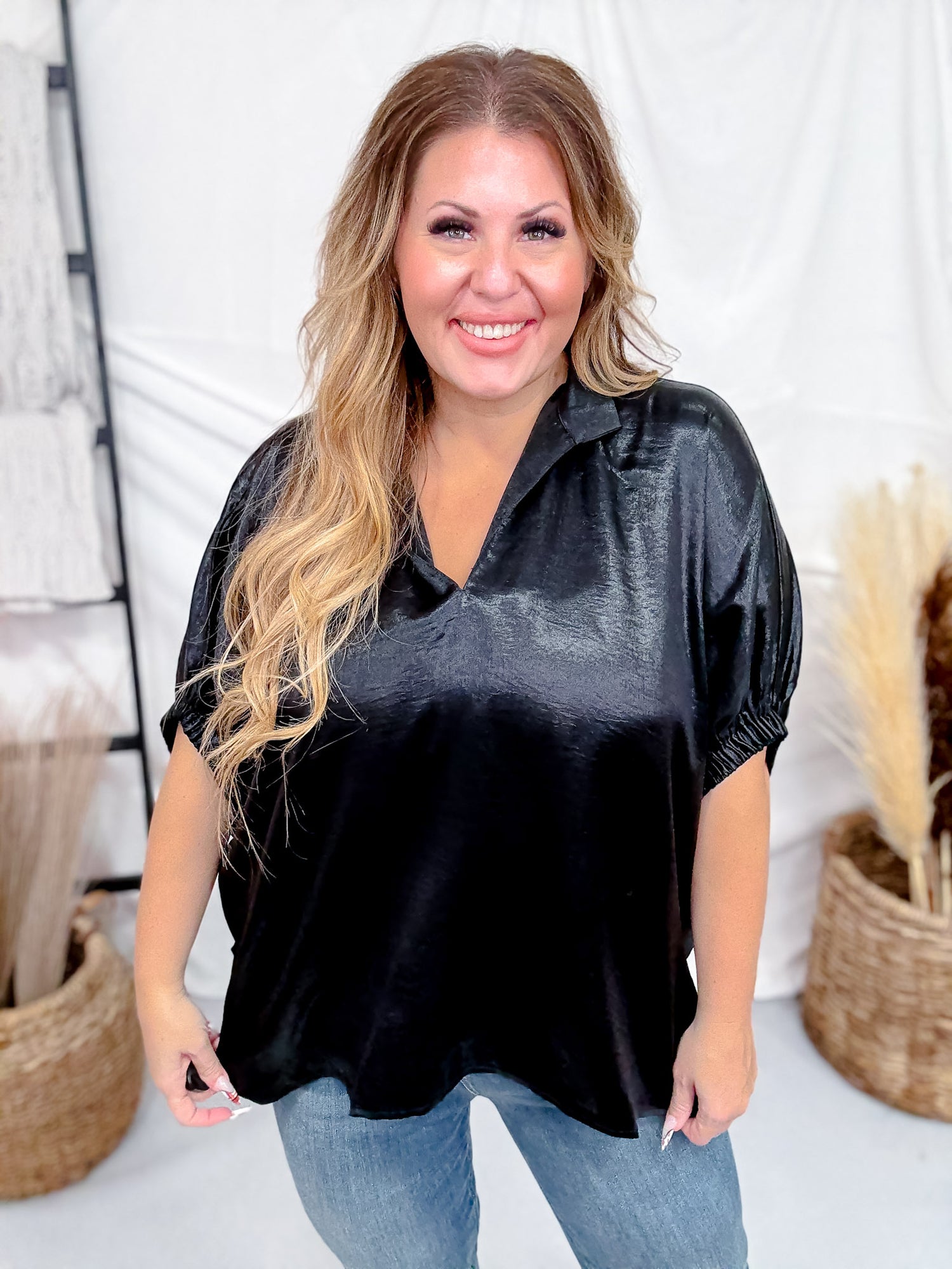 Turn heads effortlessly with this metallic black v-neck top that shines with attitude. Featuring a band collar and breezy short dolman sleeves, it offers a playful twist on classic style. The elastic cuffs add a comfy, snug fit that keeps you looking sharp from day to night. Whether you're dancing under the lights or stealing the spotlight at brunch, this top brings a sleek edge and effortless cool to any look.