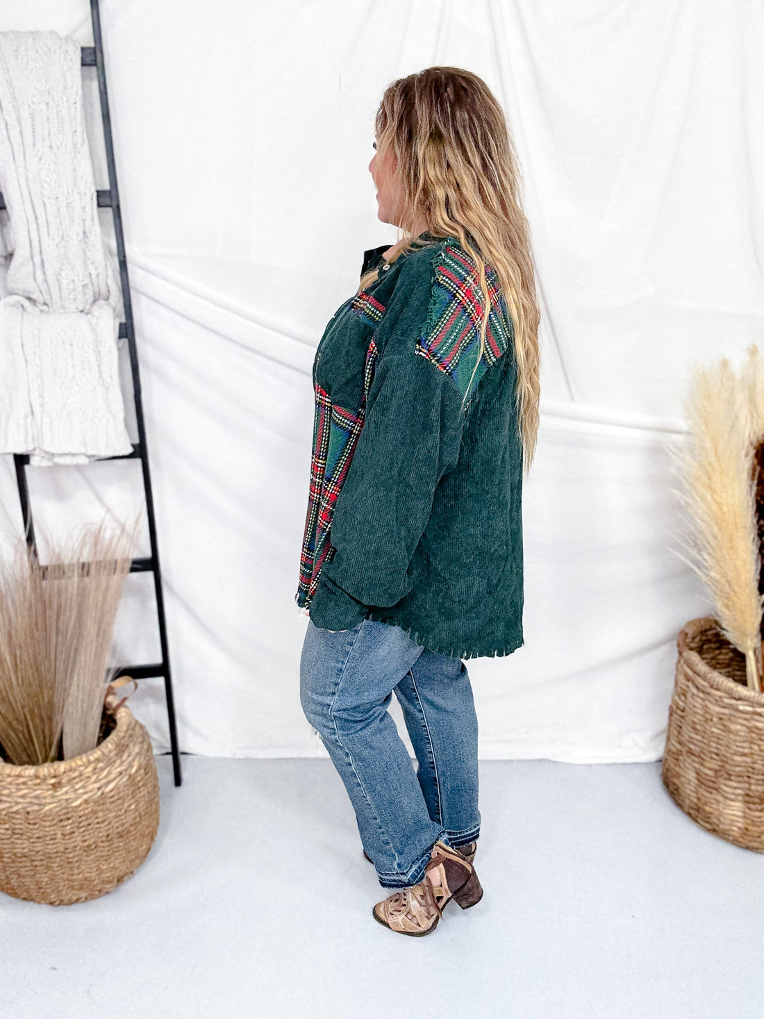 This lively shacket combines cozy black corduroy with bold green and red plaid panels for a fresh twist on layering. The frayed hems add a casual edge, making it perfect for those who love a little texture and contrast in their wardrobe. Stay comfy and stylish with this fun and versatile piece that effortlessly blends classic patterns with modern cool.