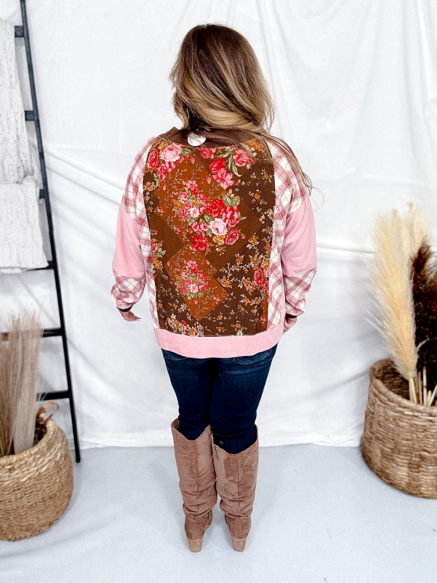 Stay cozy and stylish in this Mixed Plaid & Floral Print V-Neck Sweatshirt. Featuring a playful blend of pink and brown hues, it combines a bold brown panel with delicate floral prints, along with cheerful pink plaid accents and solid pink sections. Perfect for adding a splash of color and personality to your casual wardrobe!