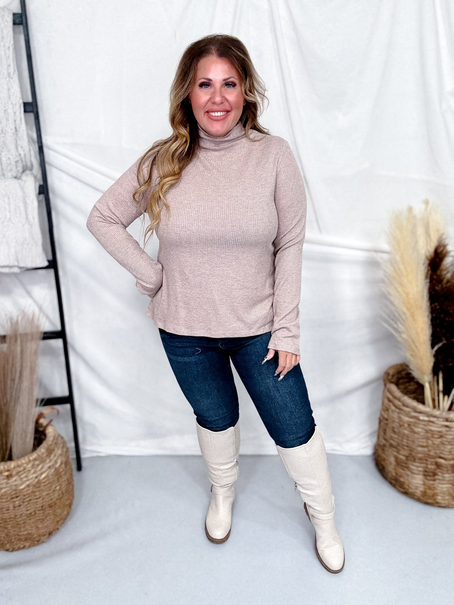 Discover the cozy charm of this Mocha Shimmer Mock Neck Sweater. Designed with ribbed knit fabric that features a delicate shimmer, it combines warmth with a stylish glow. The mock neck delivers an elegant look, while the long sleeves offer soft, comfortable coverage.