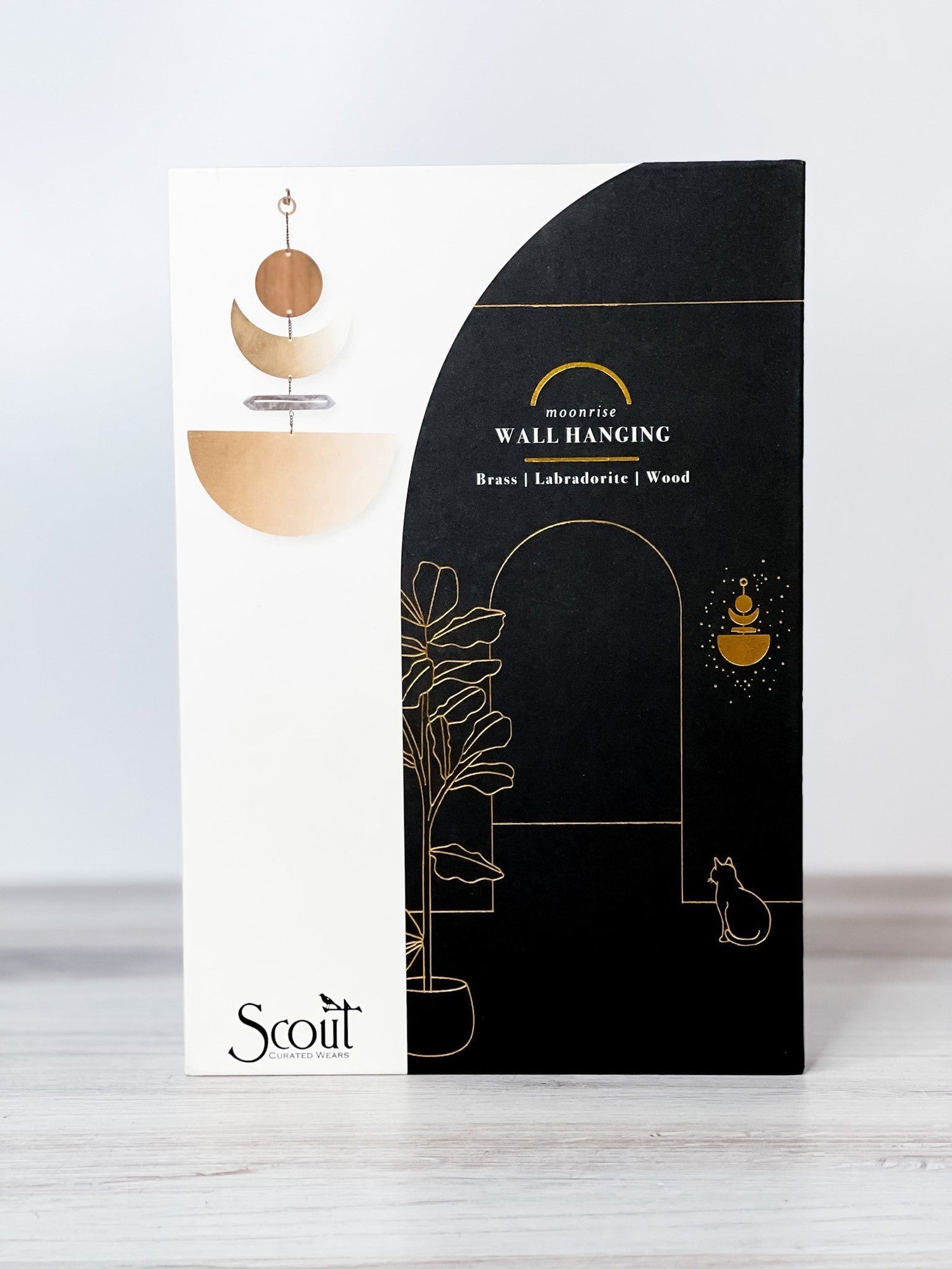 Sculptural brass and natural stone combine to create stunning wall art. Comes packed in a beautiful box & muslin bag for gift giving. Includes a metal hook for hanging intended for indoor use only. Moonrise/Labradorite/Wood Labradorite | Stone of Magic Materials: Natural brass, semi precious stone detail, hook for hanging. Dimensions: 9.25" long x 6" wide, Stone: 2.75" X 0.5" *Organic stone size will vary Brand: Scout Curated Wears