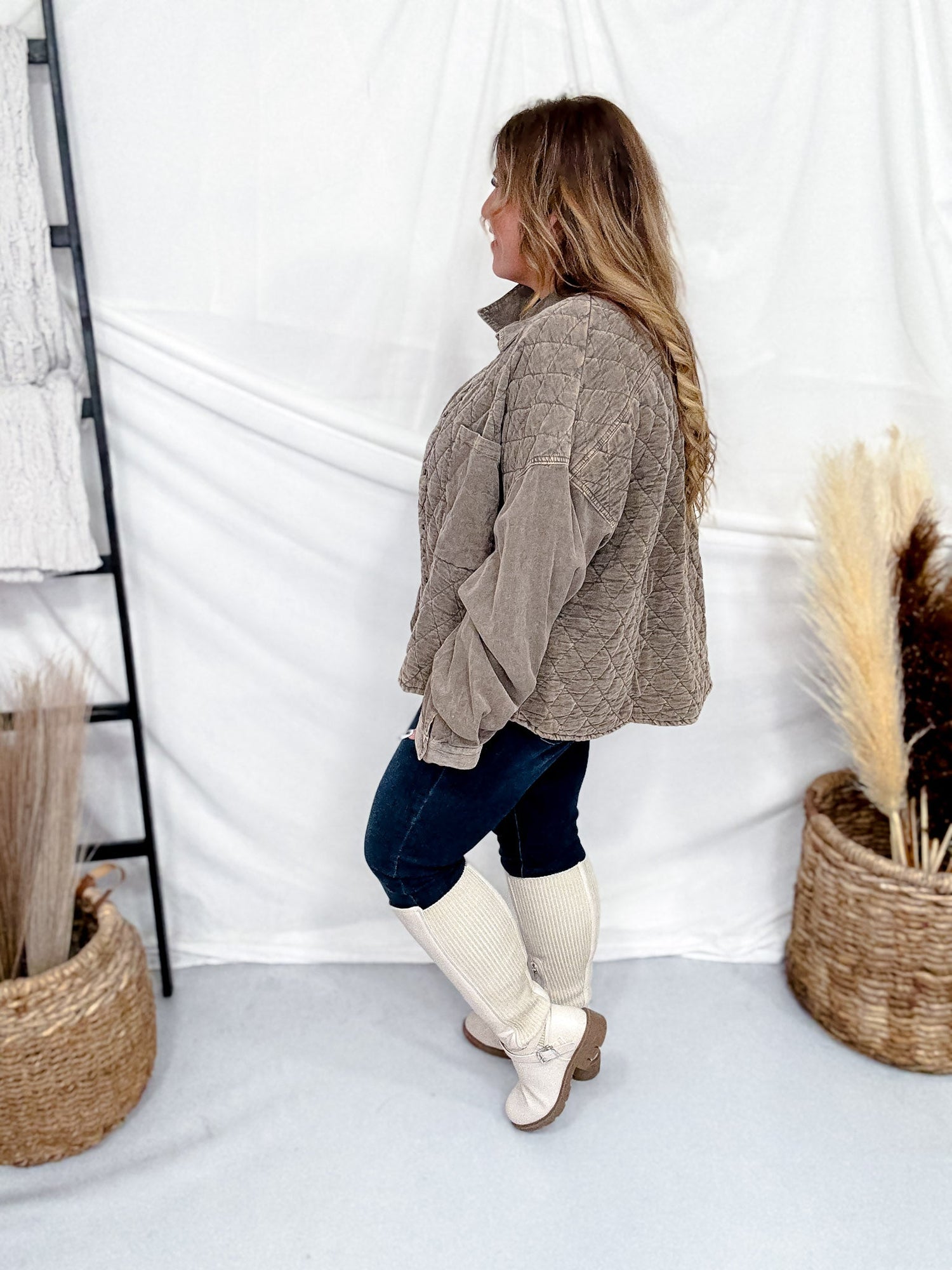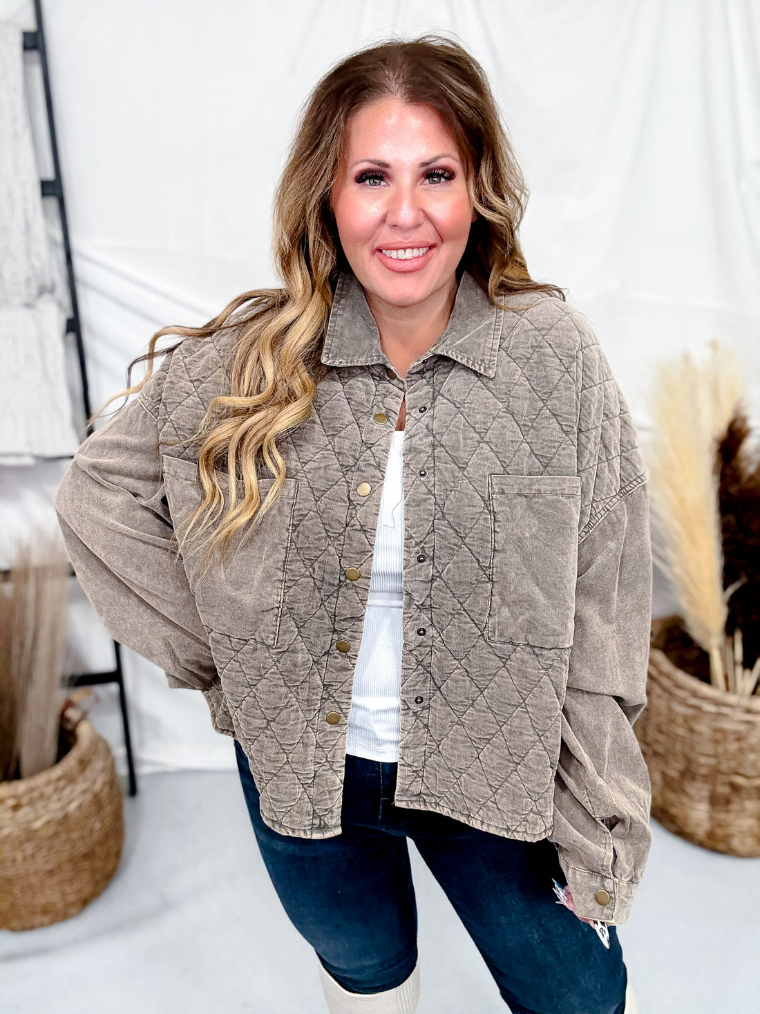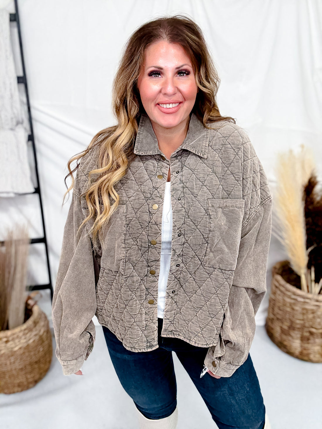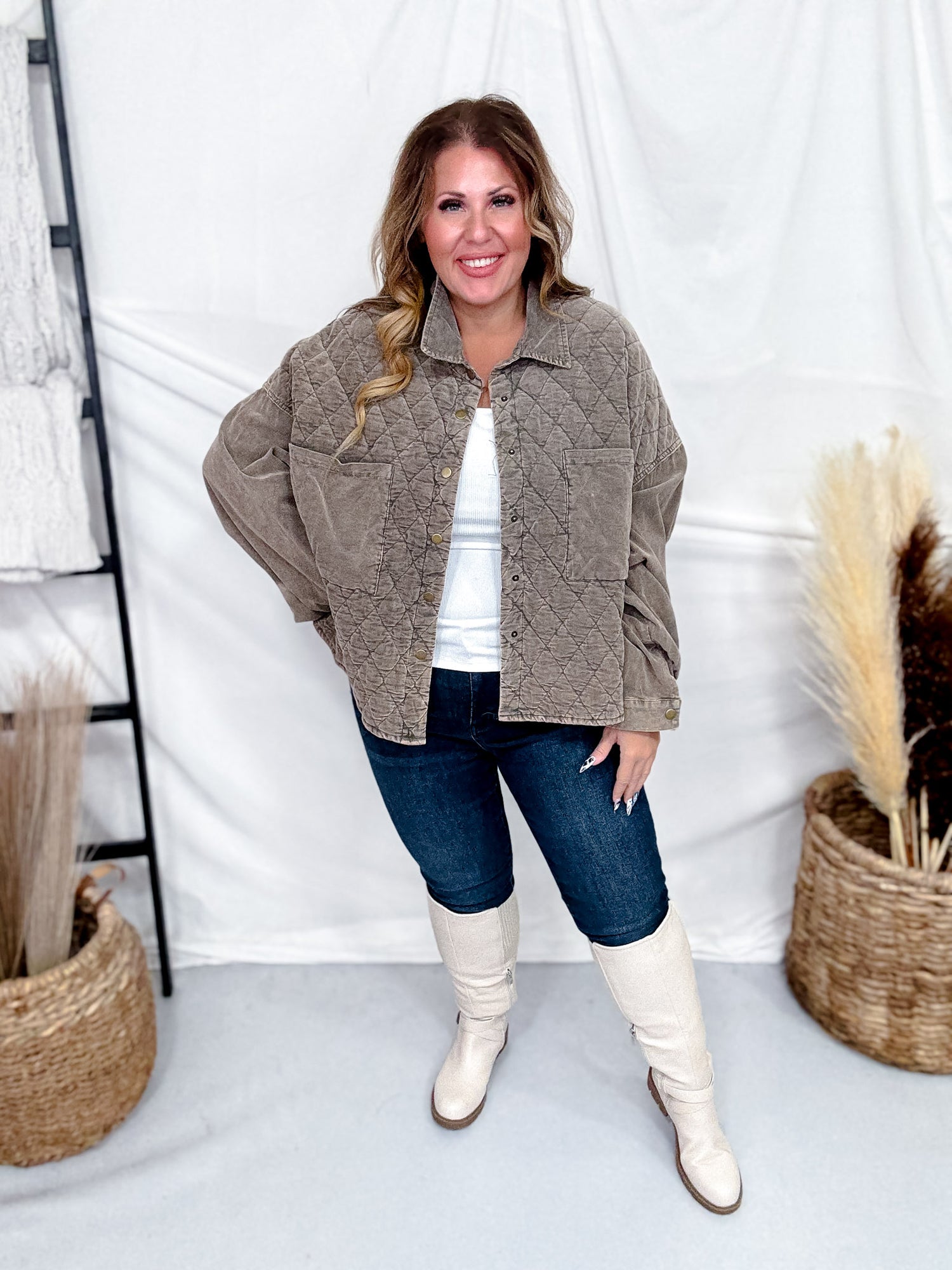 Embrace cozy vibes with this Mushroom Olive Corduroy Mineral Washed Shacket, blending the perfect earthy tones of mushroom and olive for a stylish twist. Soft corduroy fabric ensures comfort, while the mineral wash adds vintage charm and unique texture. Practical front pockets keep essentials close, making it easy to go from casual strolls to laid-back hangouts.