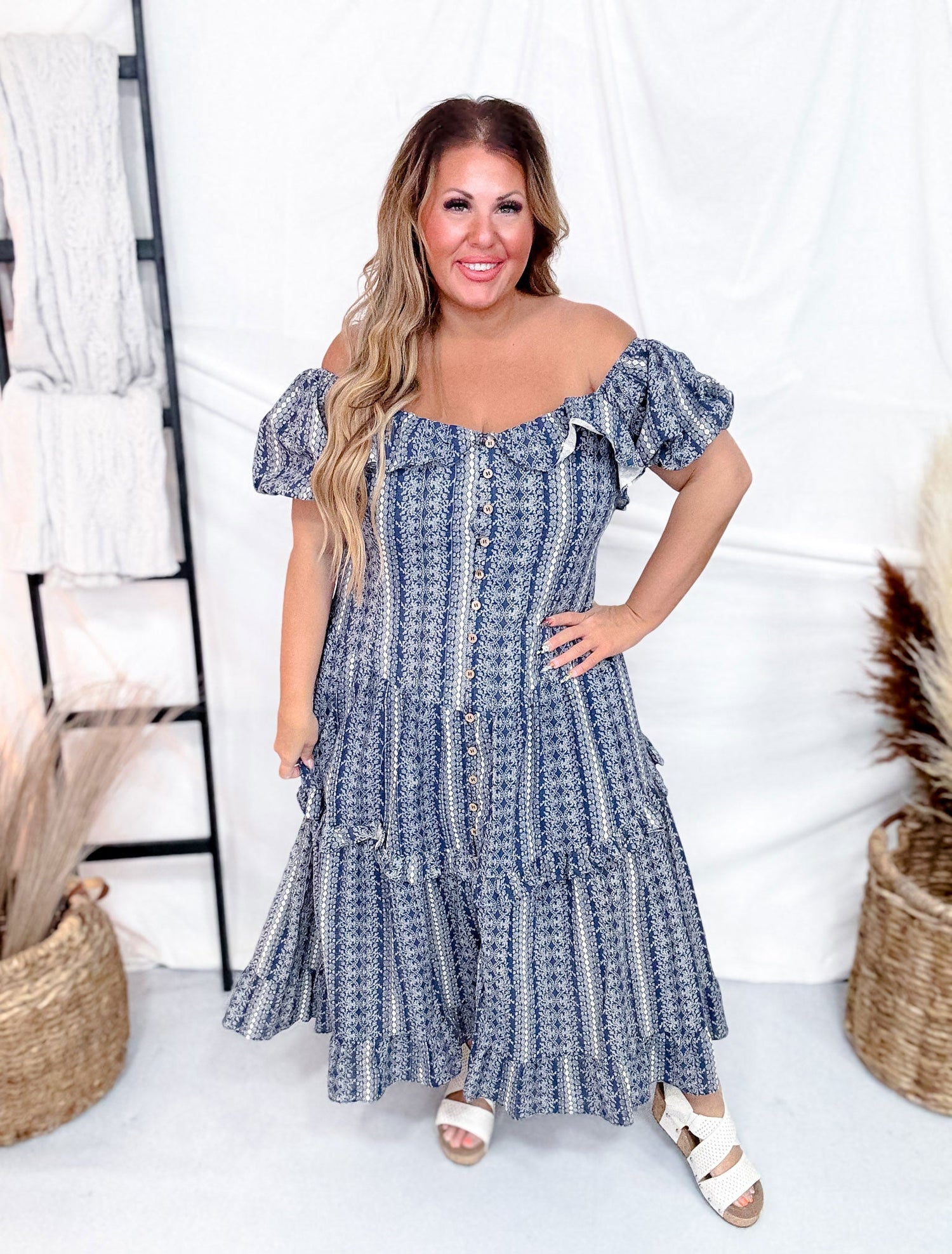 Float through your day in our Navy Button Front Balloon Sleeve Dress! This playful midi features billowy balloon sleeves and a stretchy smocked back for that perfect fit. Twirl to reveal hidden pockets (surprise!) and flirty ruffles that dance with every step. Navy never looked so fun – it's the dress that makes Monday feel like Friday!