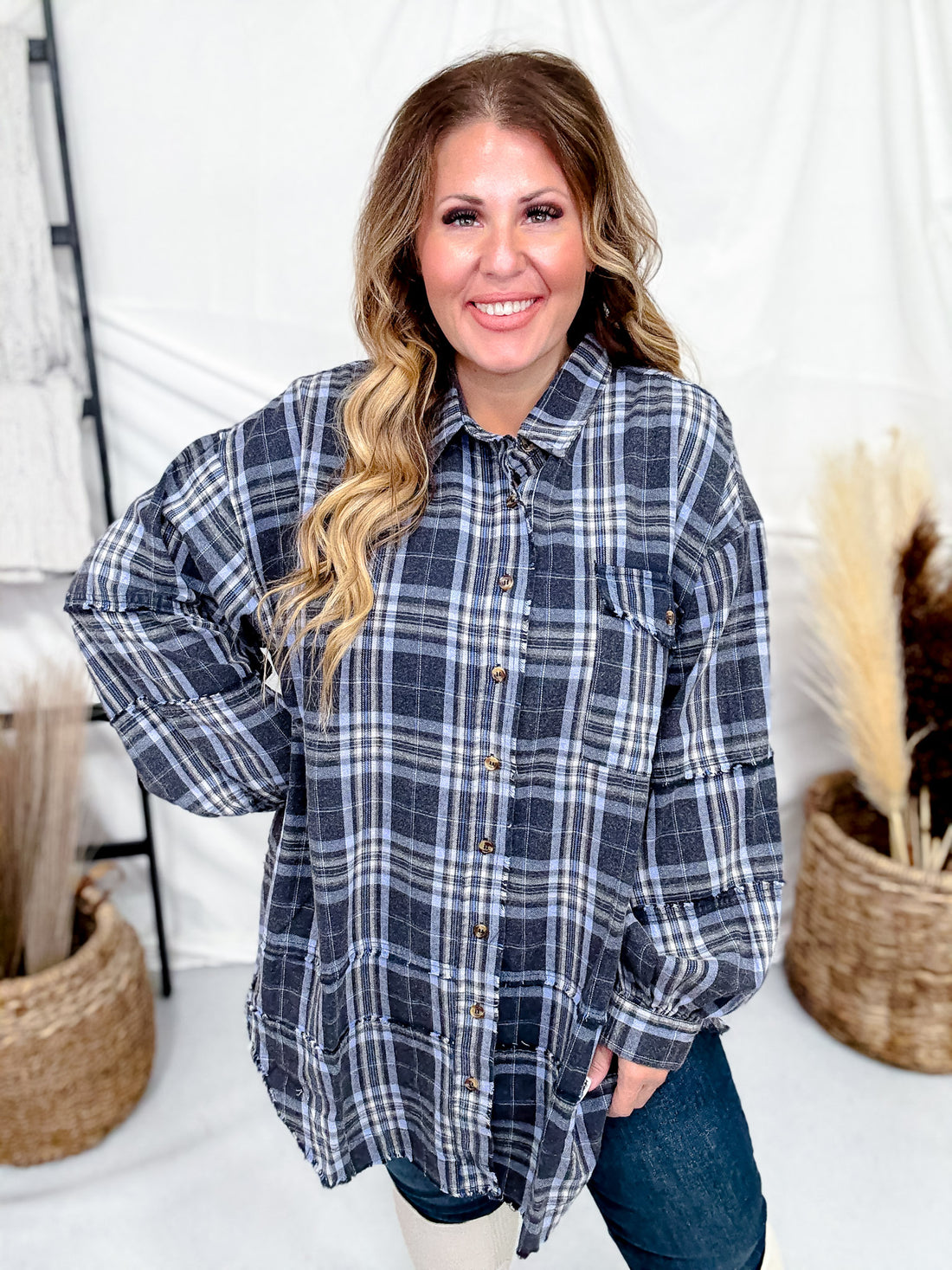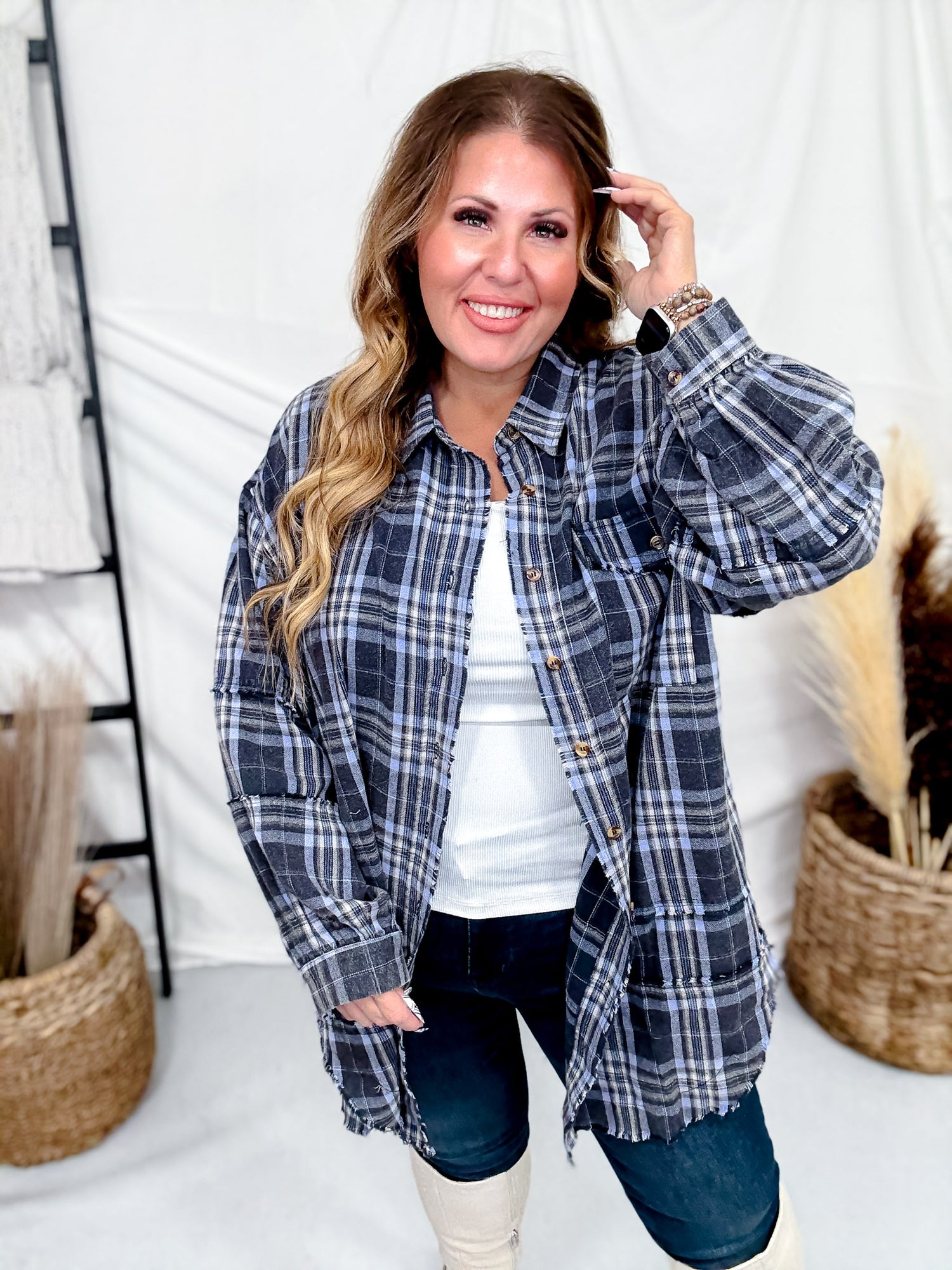 This Navy Plaid Mineral Washed Shacket is your new go-to for effortless cool. Featuring a button-front design and curved hem, it adds a fun twist to your layering game. The raw edge details give it a slightly rugged, worn-in look that’s perfect for casual days and spontaneous adventures.