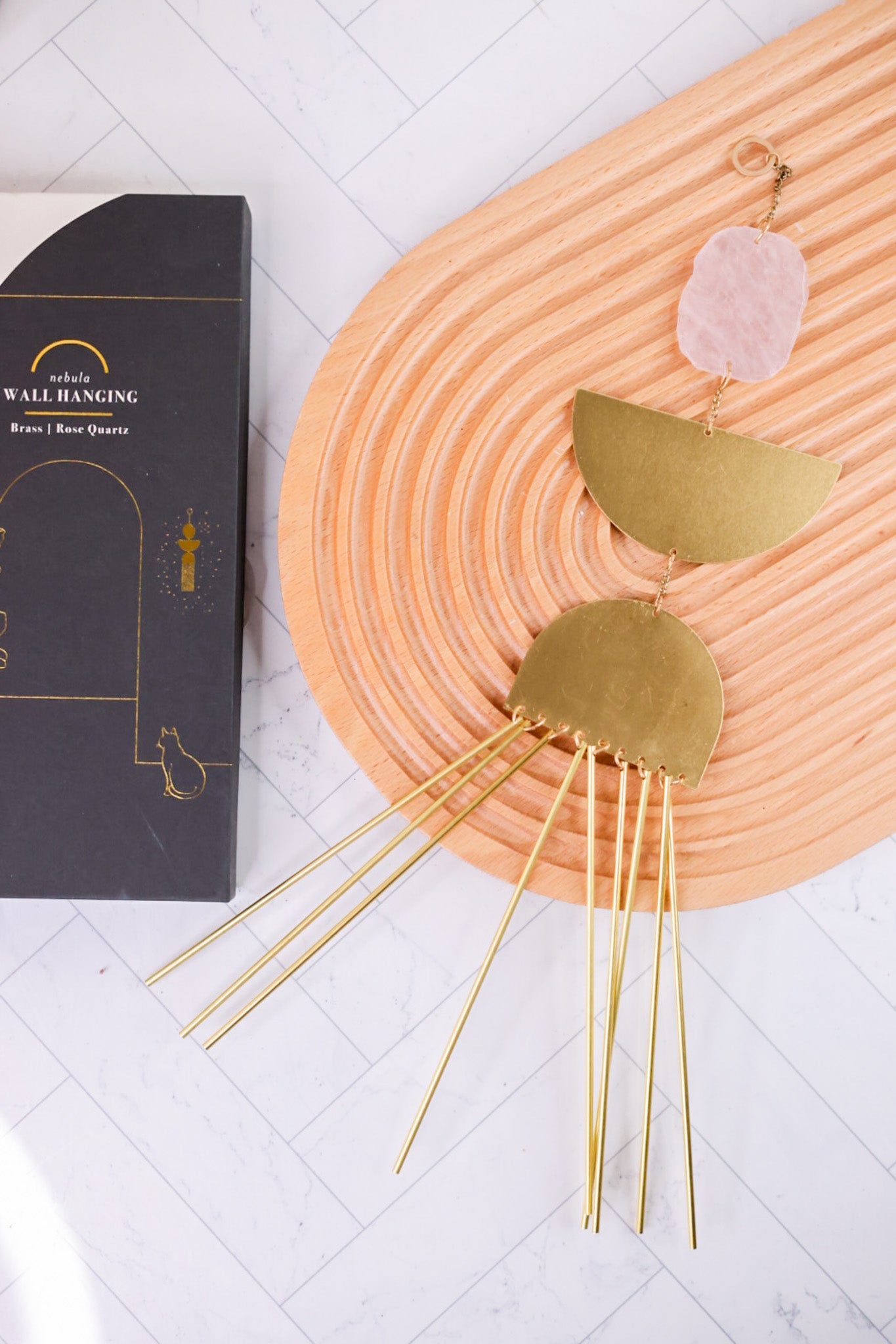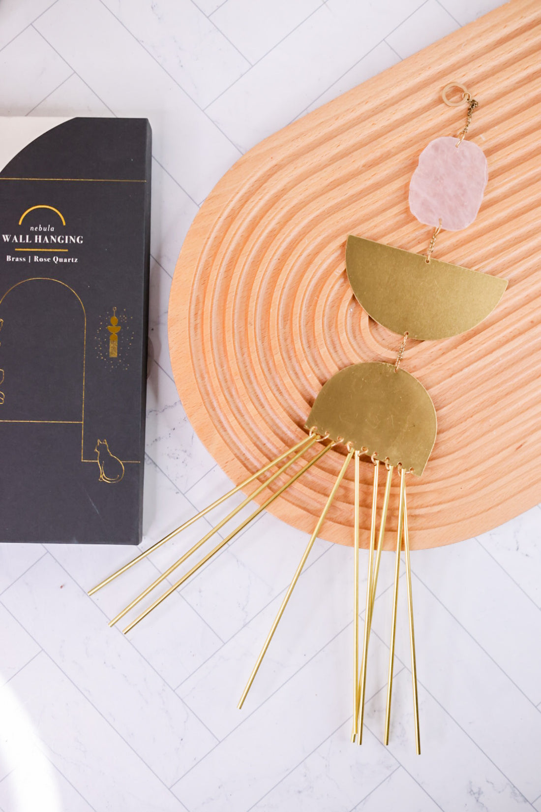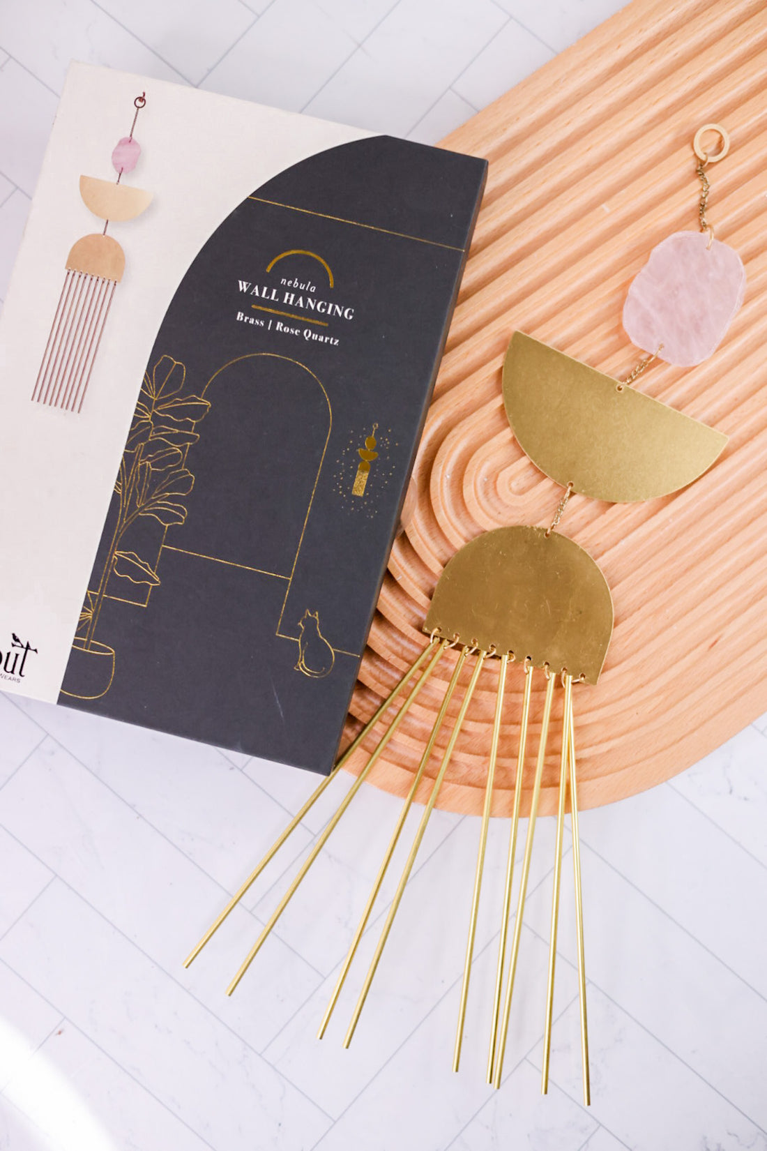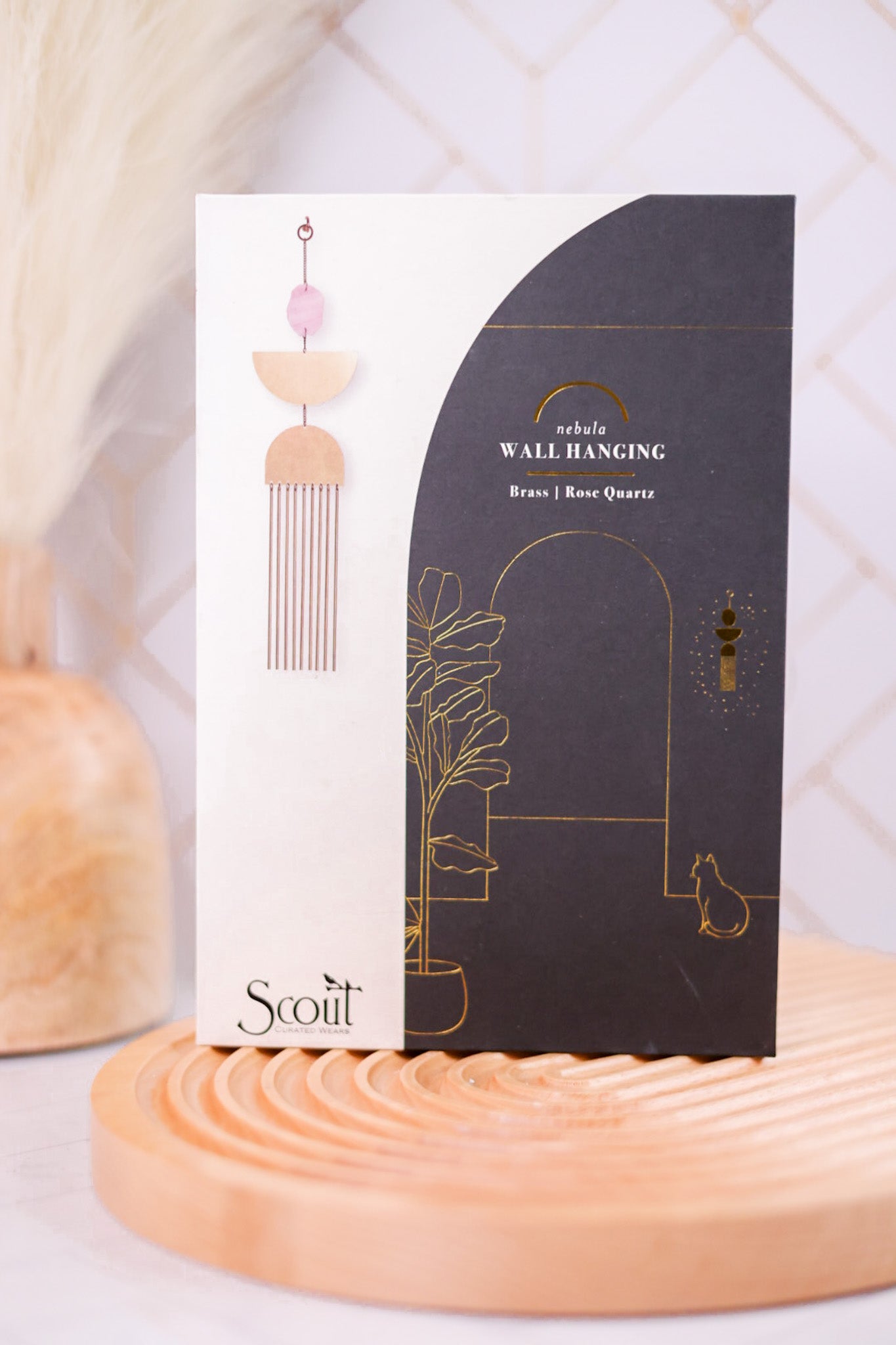 Sculptural brass and natural stone combine to create stunning wall art. Comes packed in a beautiful box & muslin bag for gift giving. Includes a metal hook for hanging intended for indoor use only. Rose Quartz | Stone of the Heart Materials: Natural brass, semi precious stone detail, hook for hanging. Dimensions: 14" long x 3.5" wide, Stone: 1.75" X 1.25" *Organic stone size will vary Brand: Scout Curated Wears