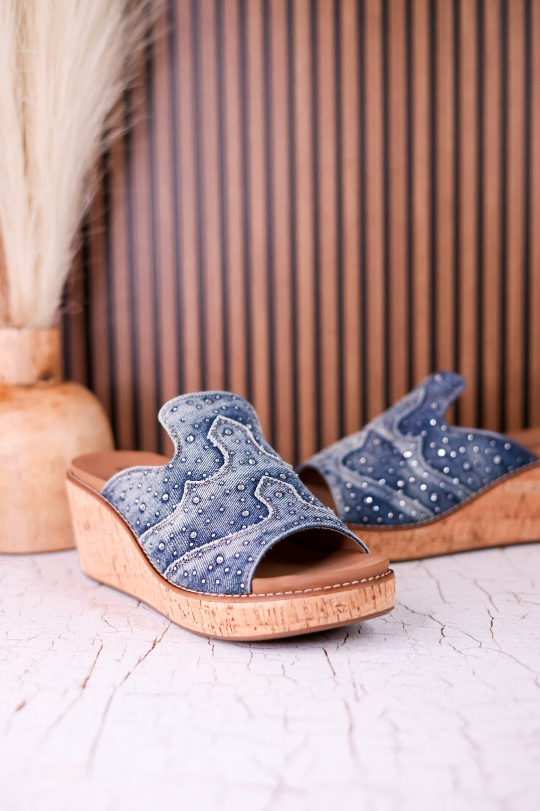 Step out with a playful twist in these Neon Moon Blue Denim & Rhinestone Wedges. Featuring a cozy cork heel for comfy strides, washed blue denim with eye-catching western-inspired stitching, and sparkling rhinestone accents that add just the right amount of sparkle to your step.