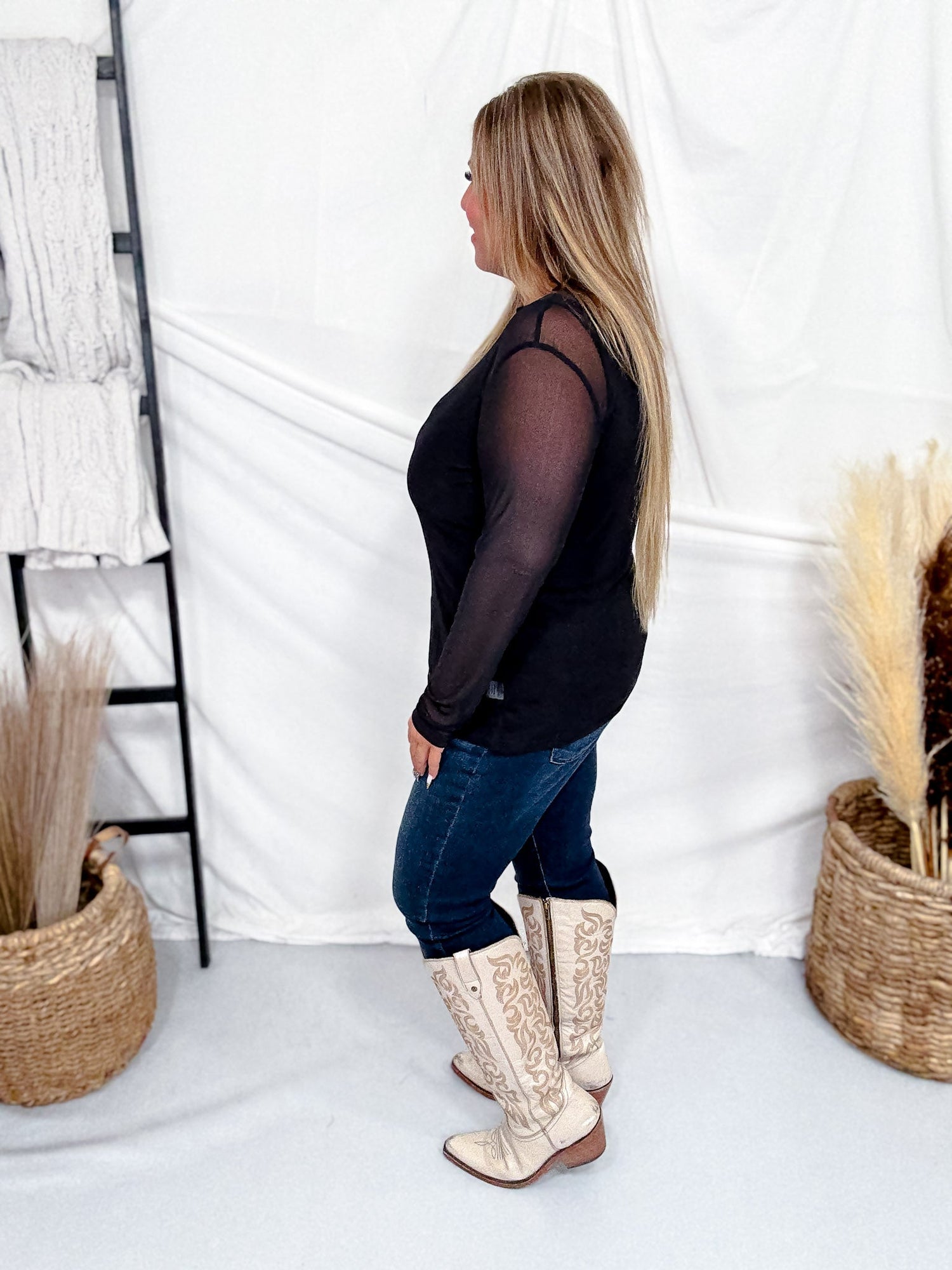 Slip into the darkness with our Night Sky Black Long Sleeve Mesh Top—a chic layering essential that's as versatile as it is moody. The sheer mesh fabric adds an edgy appeal perfect for building bold outfits, while the long sleeves keep things sophisticated. Whether you're layering over a cami, pairing with a slip dress, or going full goth-glam, this piece is your ticket to effortless cool.