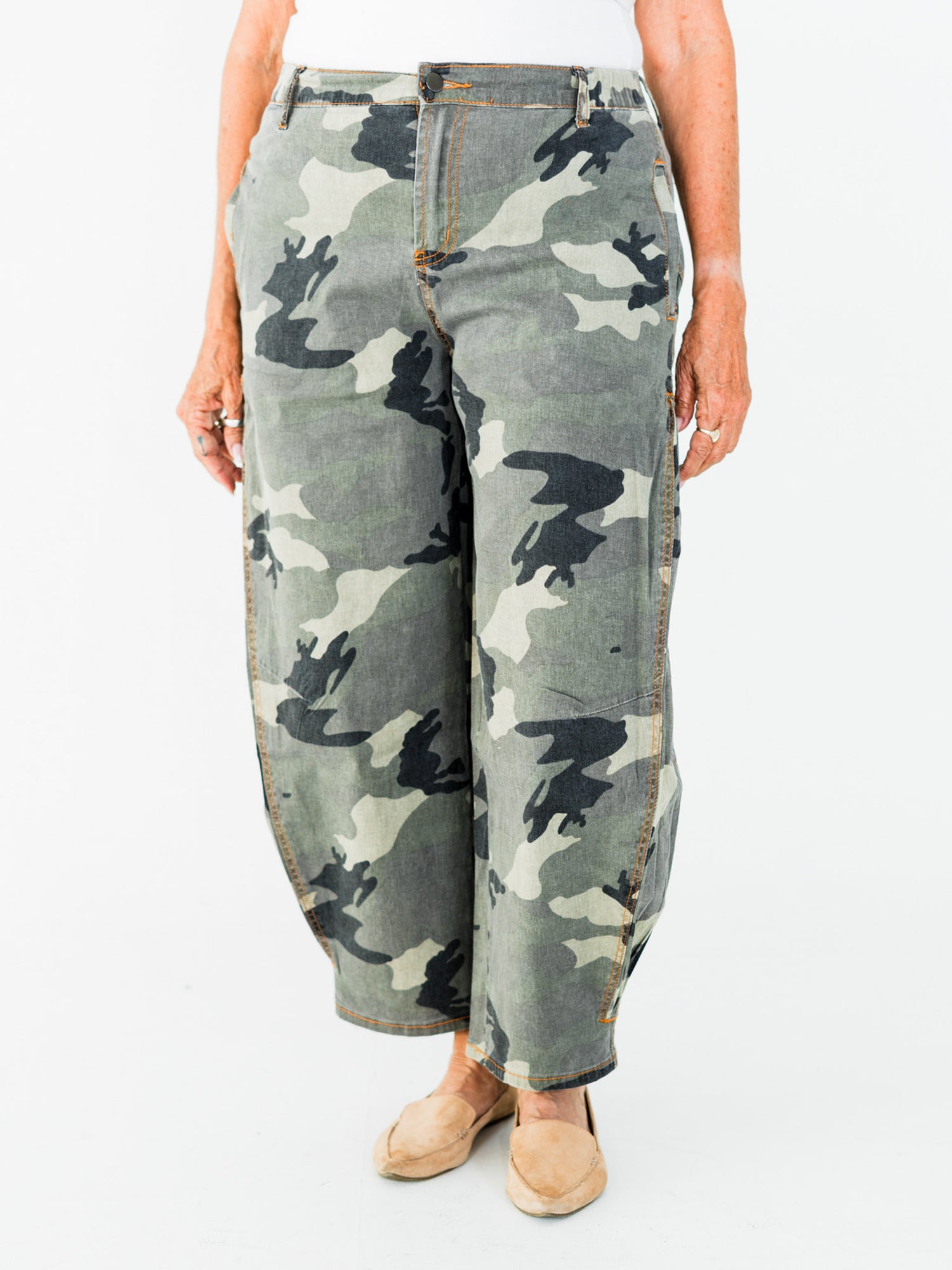These barrel leg pants feature a playful olive and gray camo print that works with basically everything. The high-waist design hugs you in all the right ways, while the relaxed barrel legs let you move freely. Crafted from twill fabric, they're built to handle whatever you throw at them—whether that's a coffee run or a full day of exploring.