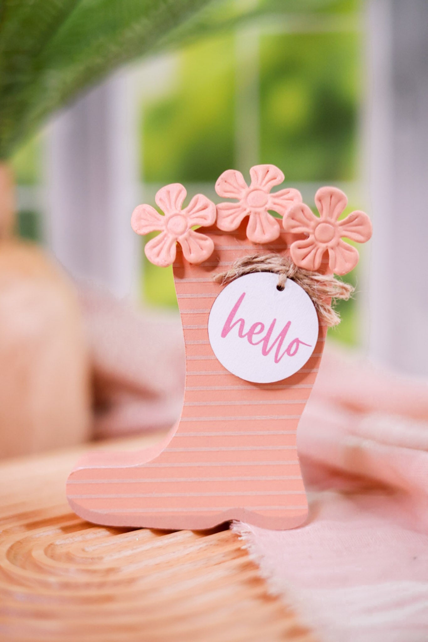 Add a charming touch to any table with our Pastel Rain Boot Table Sitter. This wooden rain boot decor is adorned with floral embellishments, making it the perfect springtime addition. Available in pastel blue, pink, or white and yellow polka dots, it's sure to brighten up any space.