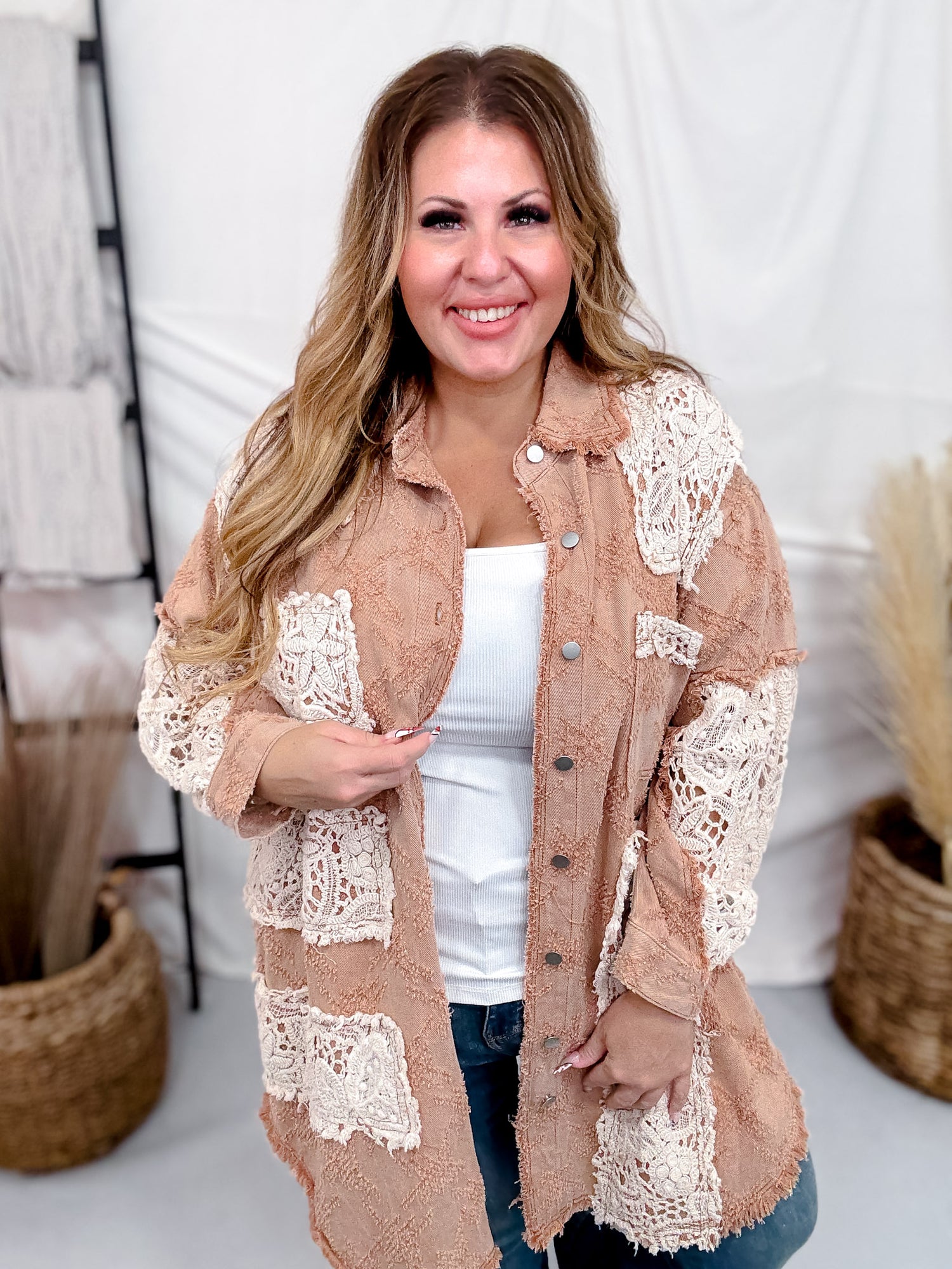 This peach jam-colored long sleeve shacket is your new favorite blend of cozy and cute. Featuring charming crochet patchwork details, it adds a touch of handmade flair to your everyday look. The button-up front lets you style it open or closed, perfect for layering on cooler days or adding a pop of color to your outfit.