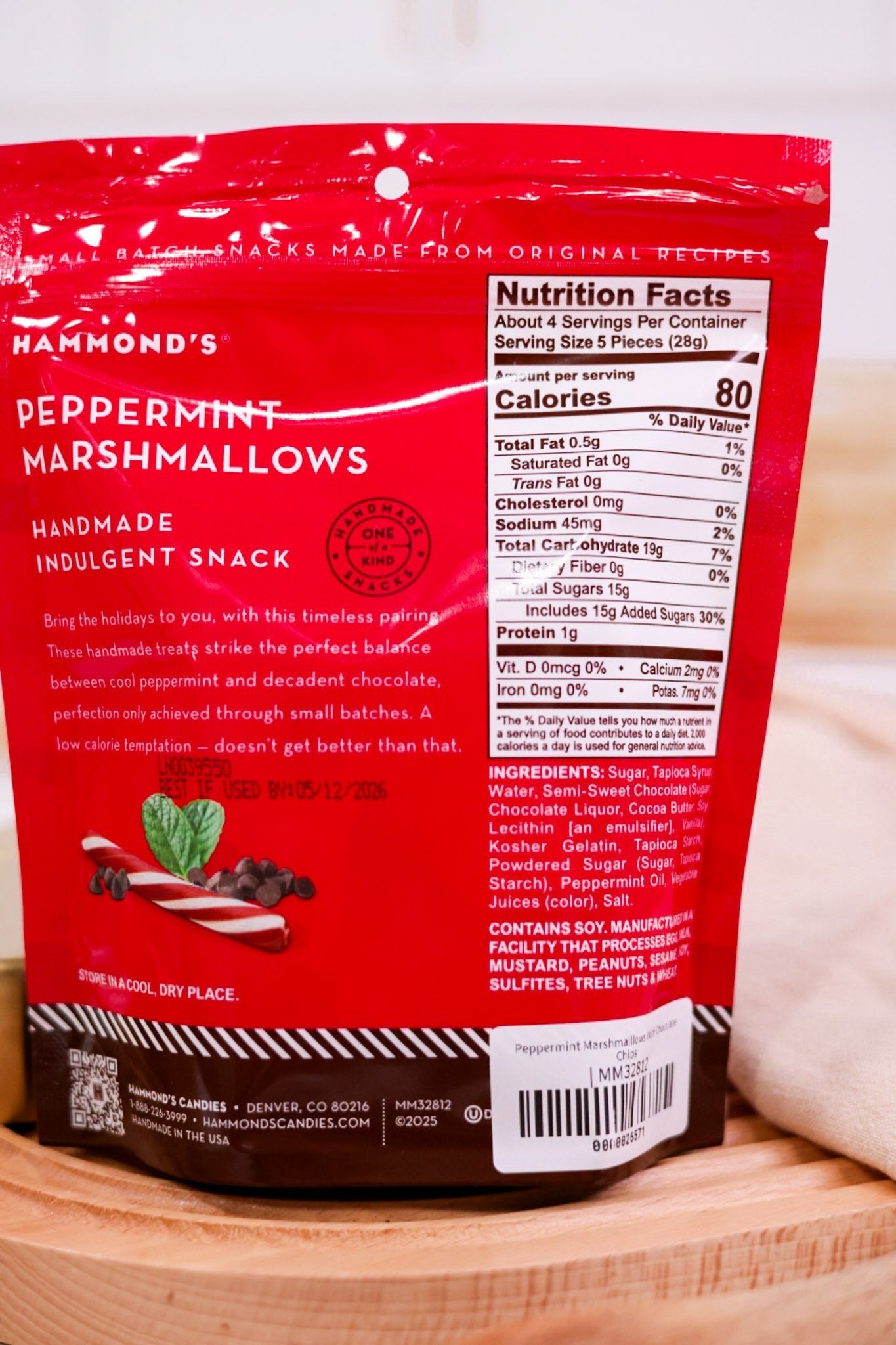 Indulge in these small-batch, handcrafted peppermint marshmallows topped with mini chocolate chips for a festive treat that feels decadent yet stays light. Perfectly fluffy with a hint of cool peppermint, they bring holiday joy without the guilt. Pop one in your hot cocoa or enjoy straight from the bag—either way, these marshmallows make every moment a little sweeter and a lot more fun!