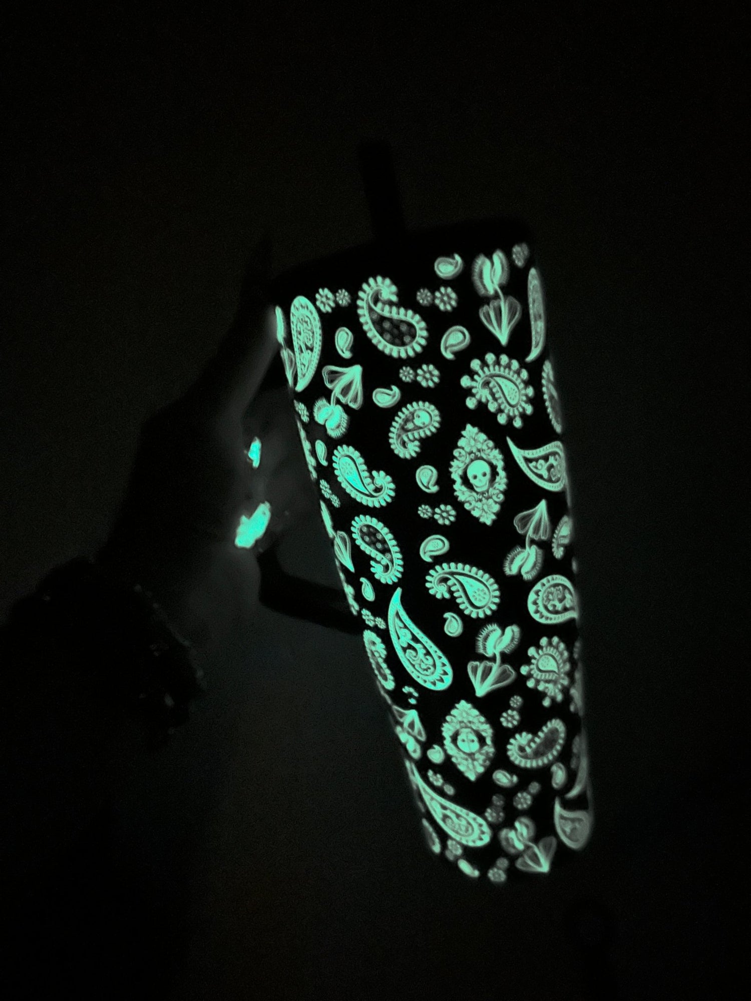 The Glow In The Dark Phantom Paisley 40oz Era tumbler features a secure lid that prevents spills, keeping your drinks fresh and steady. Equipped with a ColdKey™ stainless steel straw and BevGuard™ technology, it maintains ice for a full 24 hours. Its base fits easily into most cup holders, making it a reliable companion for all your travels.