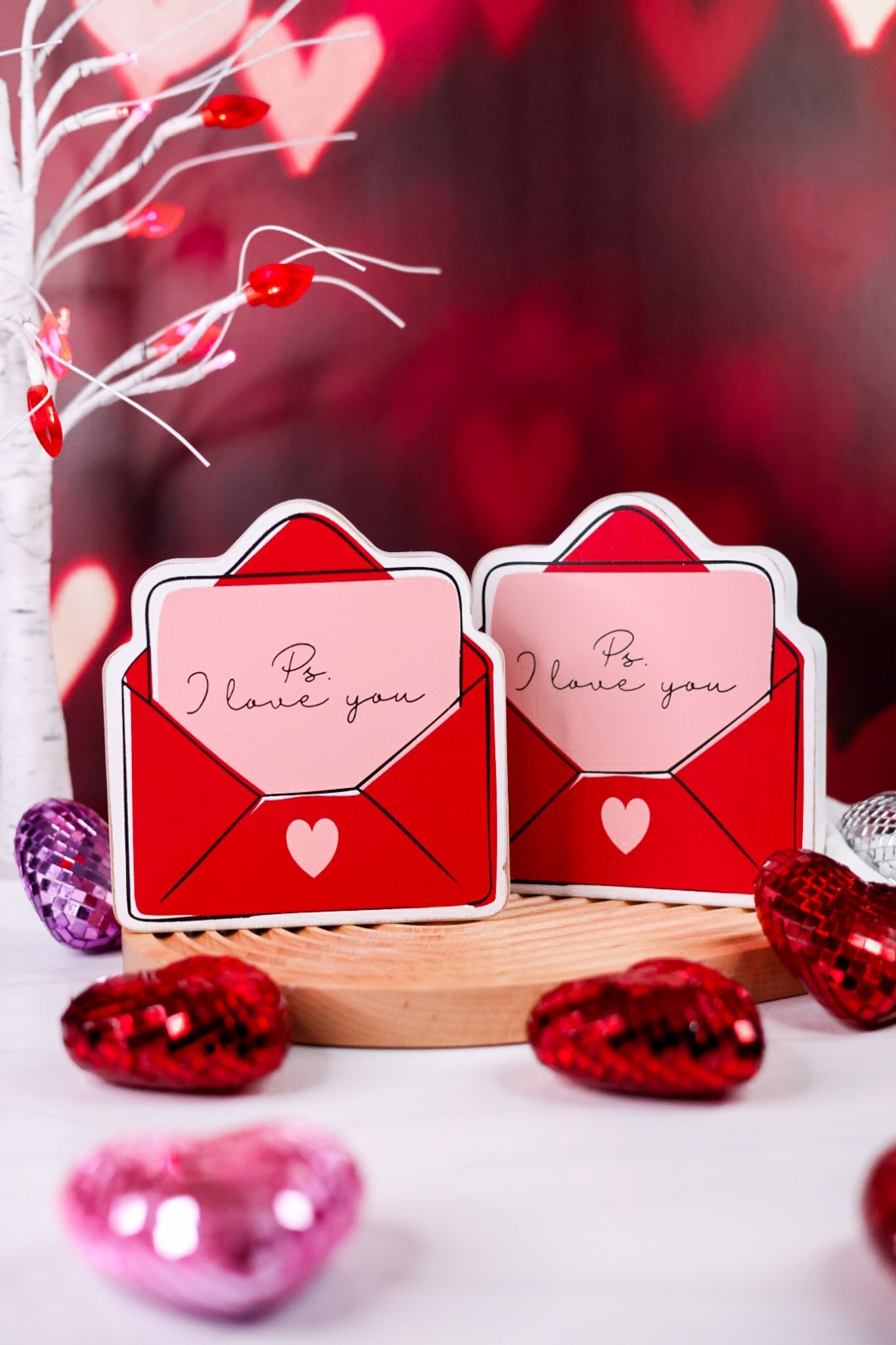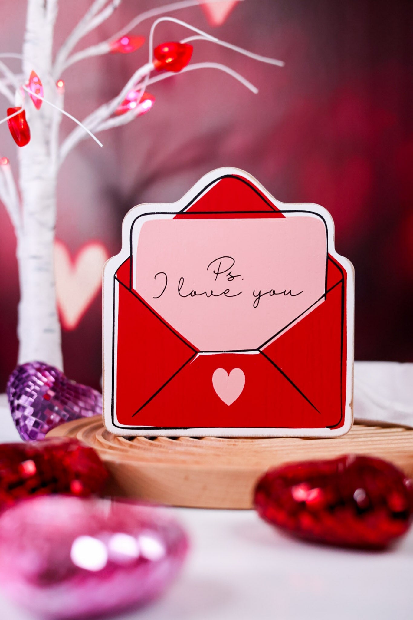This charming wooden sitter features a sweet "PS I love you" love letter design in pink and red on both sides—so it looks perfect from any angle. Ideal for Valentine's Day decorating or year-round tabletop charm, this reversible piece adds a playful touch of romance to any room. Simple, sweet, and endlessly adorable.