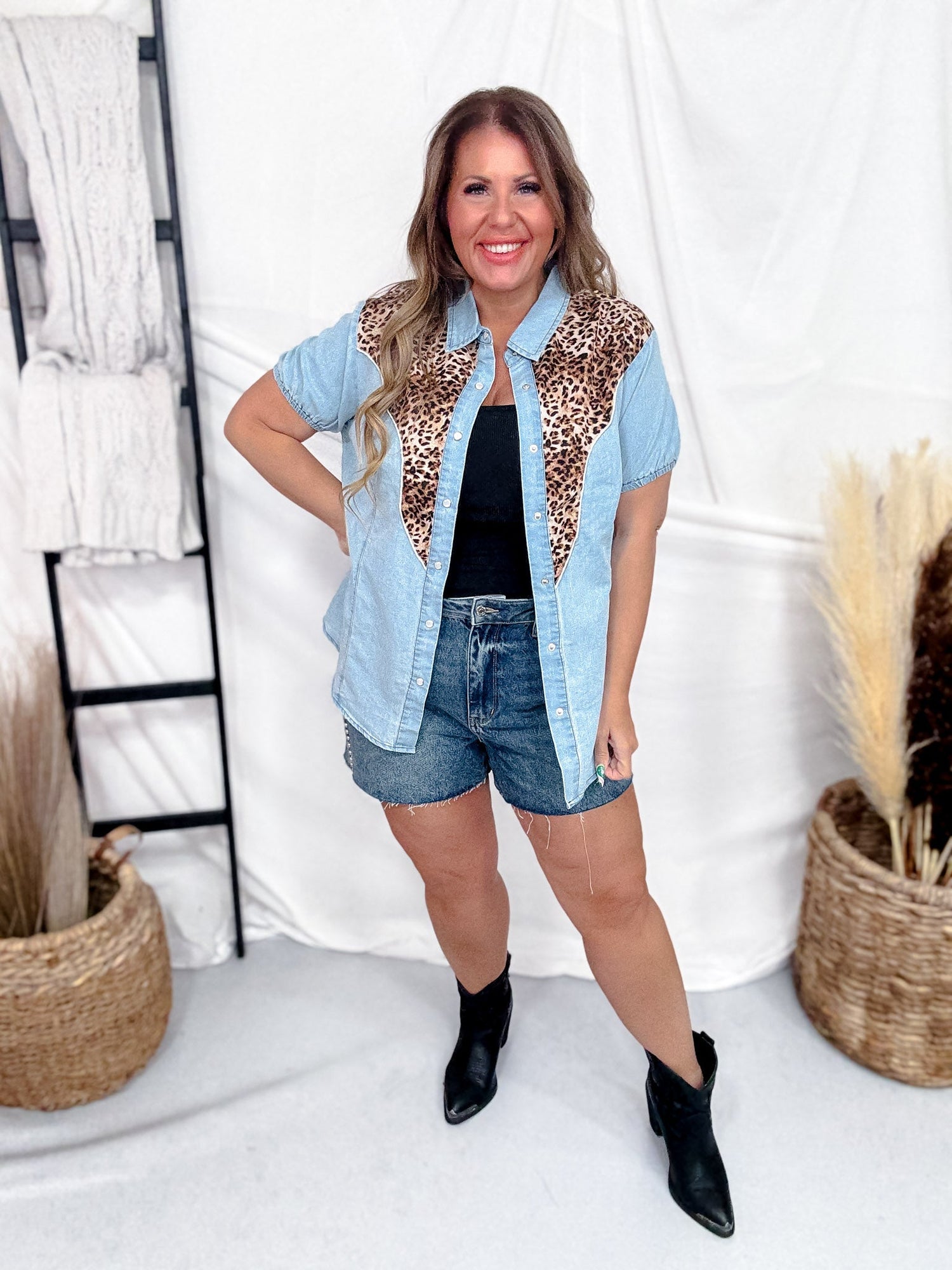 This eye-catching top blends classic denim with bold leopard print for a look that turns heads. The short sleeves keep you cool while the mixed textures add personality to any outfit. Whether you're heading to the rodeo, hitting the dance floor, or enjoying a summer country concert, this piece delivers Western-inspired style with a modern edge.