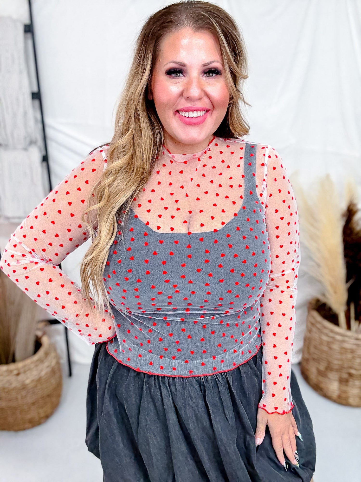 This playful red and white mesh long sleeve layering top is covered in charming heart patterns, perfect for adding a fun and flirty touch to any outfit. Its lightweight mesh fabric makes it ideal for layering, giving you endless styling options from casual days to festive nights. The breathable material keeps you comfortable while the vibrant colors brighten your look.