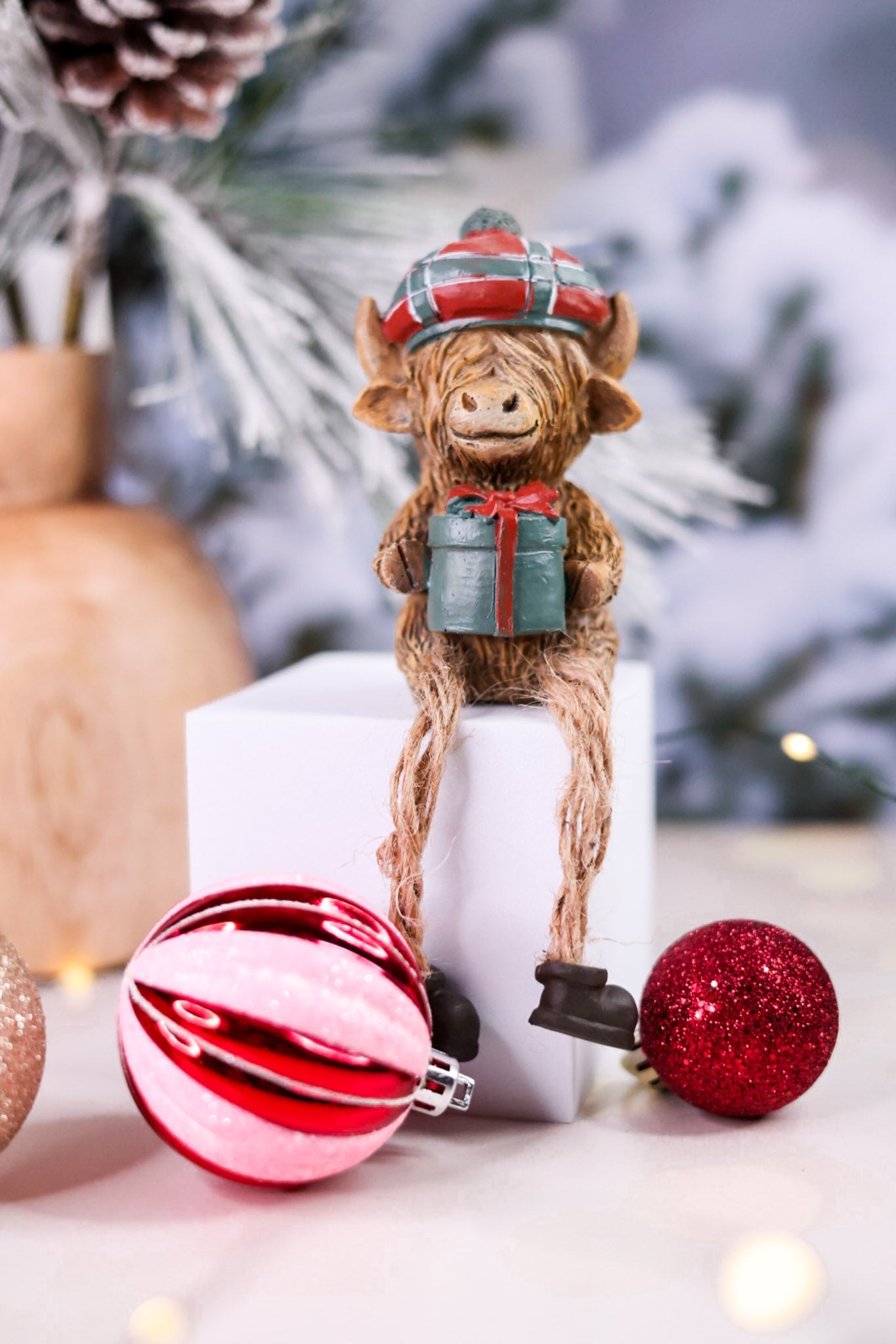 Bring festive cheer to your shelves with these playful Resin Highland Cow Shelf Sitters. Available in two charming styles—one adorned with a bow and Christmas tree, the other sporting a cozy hat and a wrapped present—each captures holiday spirit with a whimsical touch. Perfect for adding a cozy, rustic vibe to your seasonal décor.