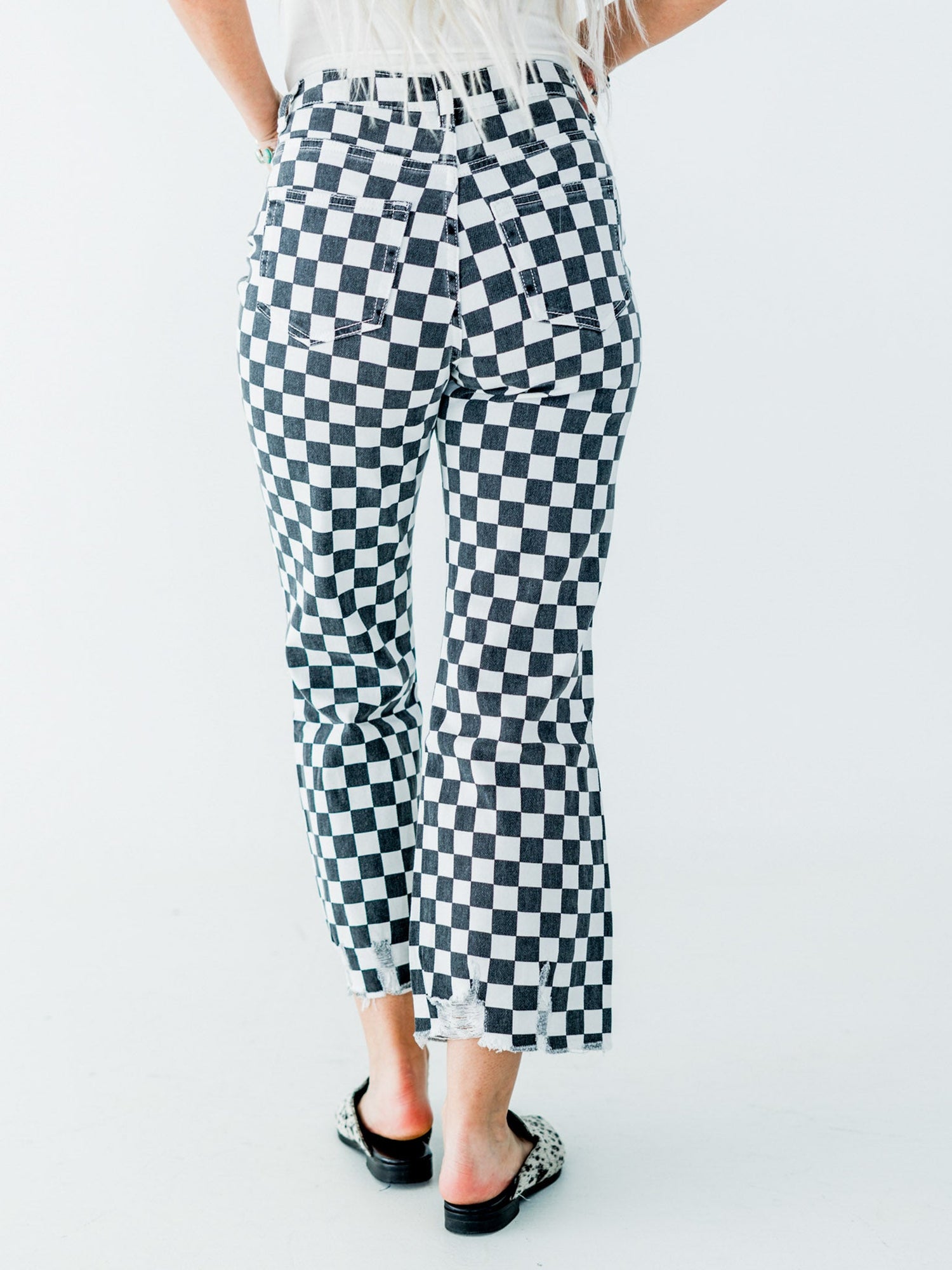 Stand out effortlessly with the Round The Track Jeans, featuring a distinctive faded black and white checkered pattern and stylish distressed holes at the knees. Designed to combine bold fashion with comfort, these jeans are the perfect choice to upgrade your wardrobe and showcase your confident, trend-savvy side.