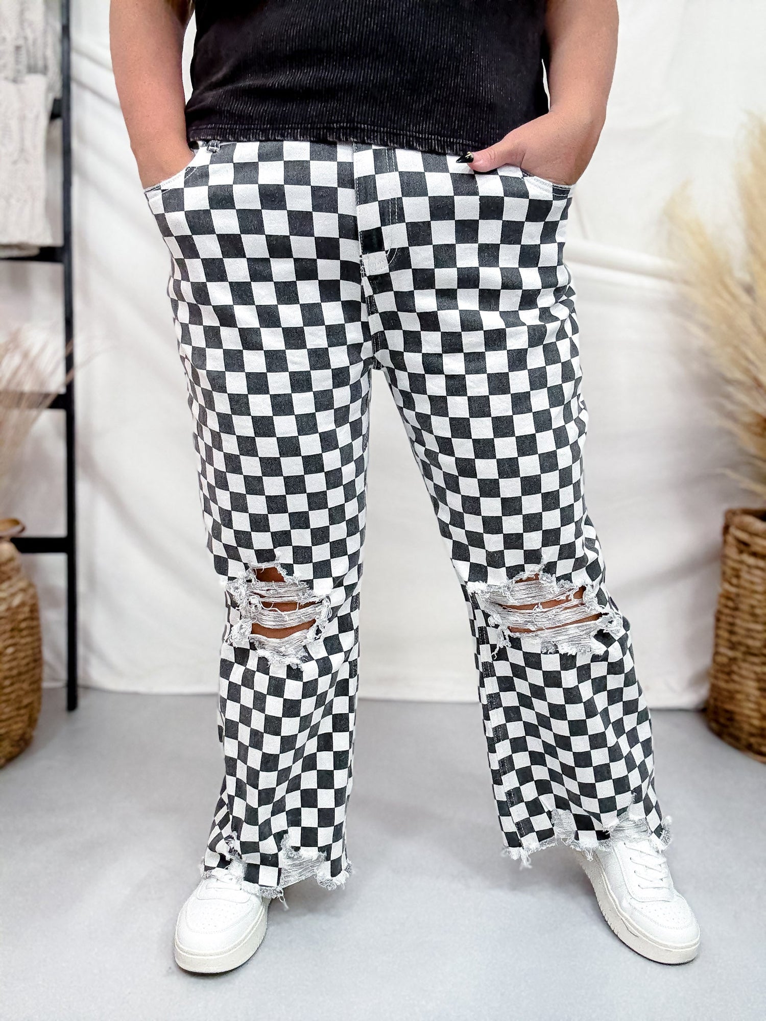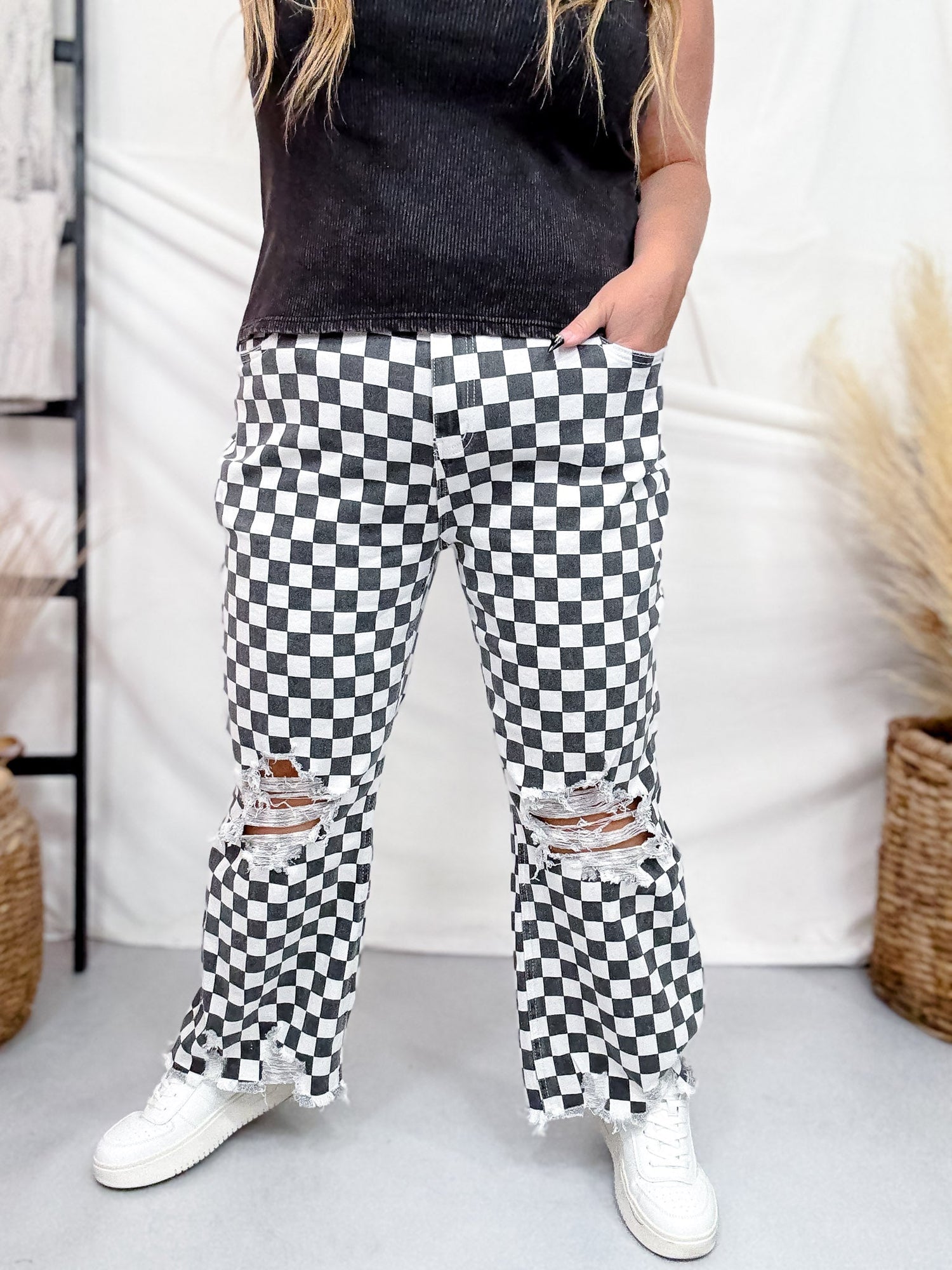 Stand out effortlessly with the Round The Track Jeans, featuring a distinctive faded black and white checkered pattern and stylish distressed holes at the knees. Designed to combine bold fashion with comfort, these jeans are the perfect choice to upgrade your wardrobe and showcase your confident, trend-savvy side.