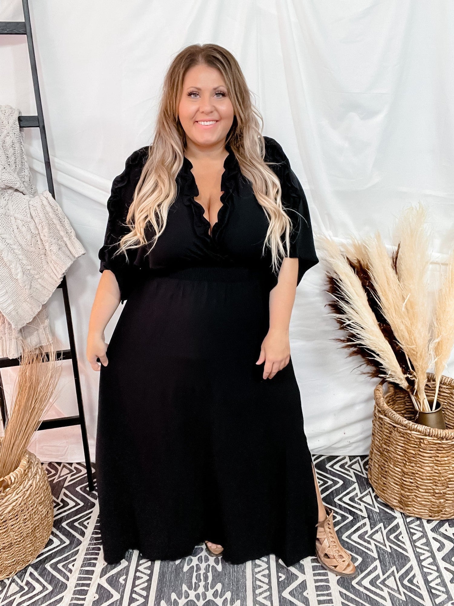 This stunning dress features a smocked waist, ruffle detailed surplice top that will accentuate your curves, and one side slit detail.
