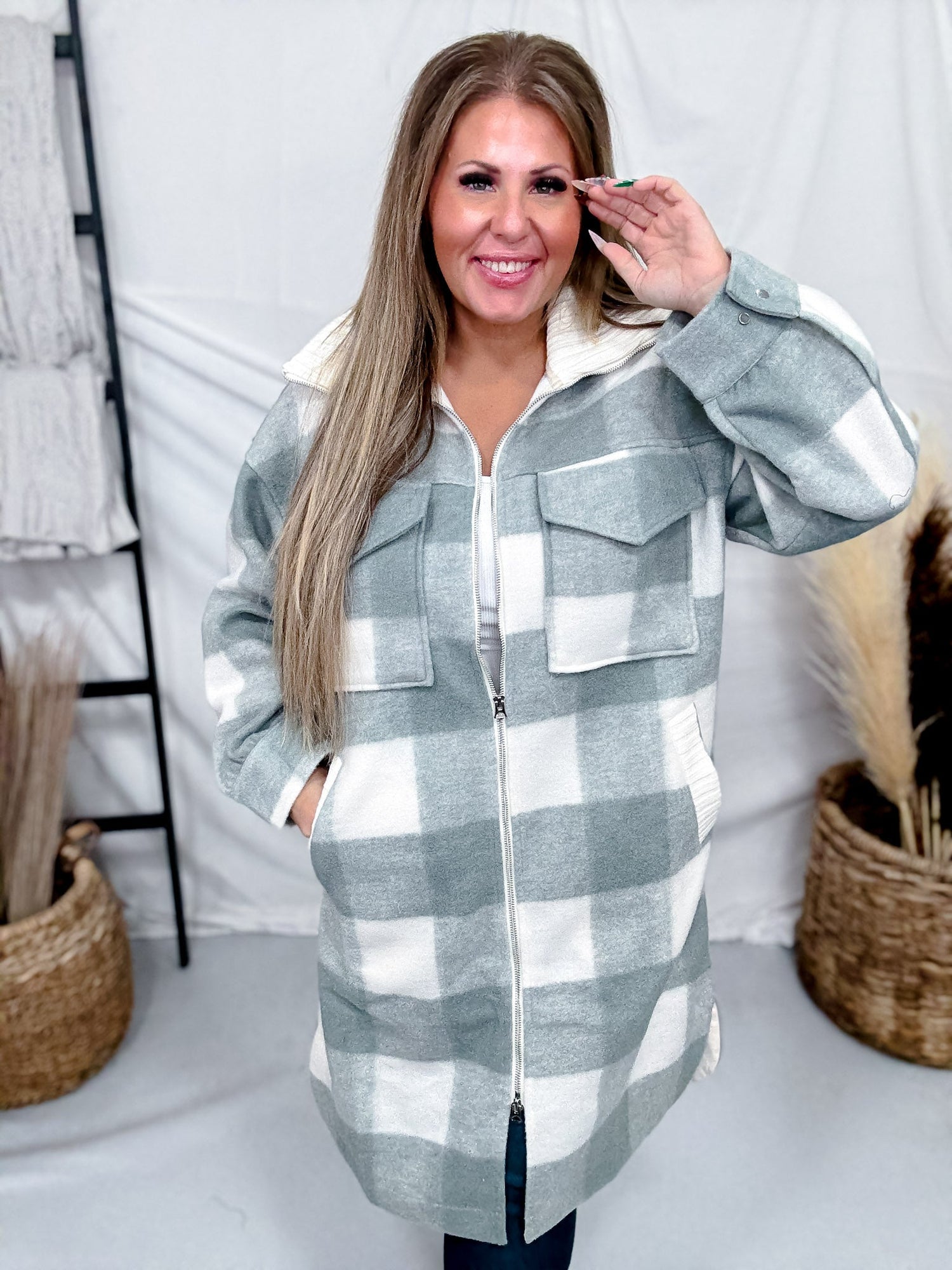 Sage Long Sleeve Checkered Print Jacket W/ Zip Up Front