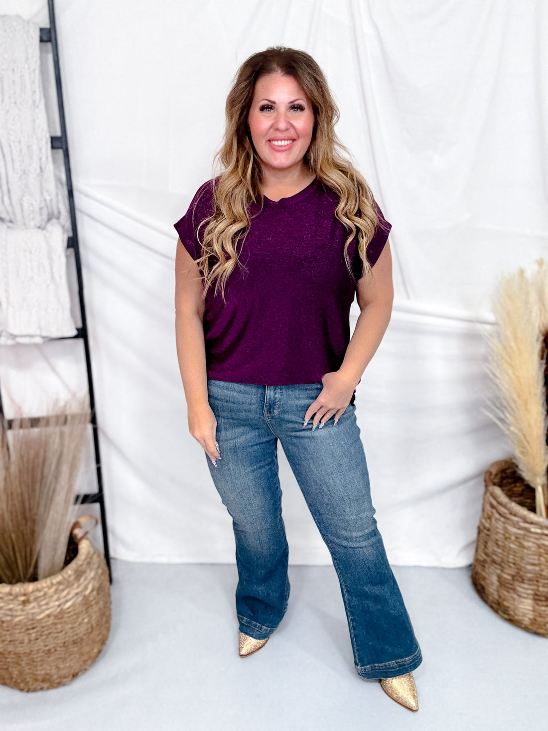 Shimmery Purple Cap Sleeve Top With Round Neckline