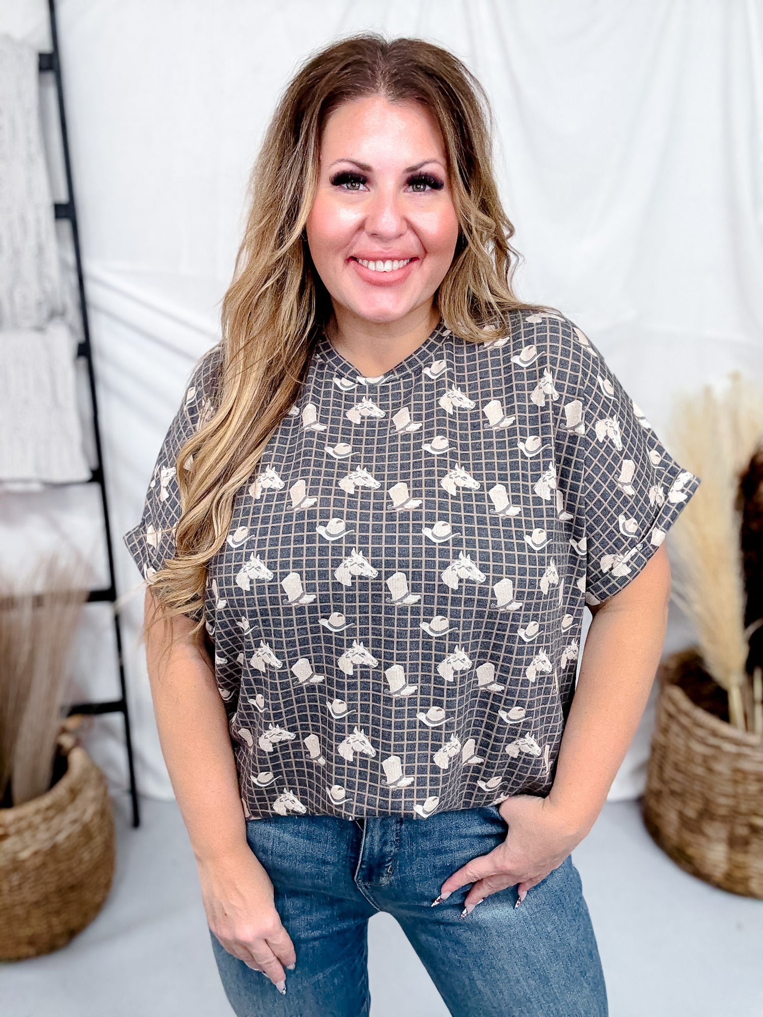 This playful short sleeve top features an adorable pattern of horses, cowboy hats, and boots, bringing a fun country vibe to your wardrobe. The cuffed sleeves add an extra touch of style and comfort, making it perfect for casual outings or spirited gatherings. Lightweight and easy to wear, it’s a charming choice for those who love a dash of Western flair with a cute, youthful twist.