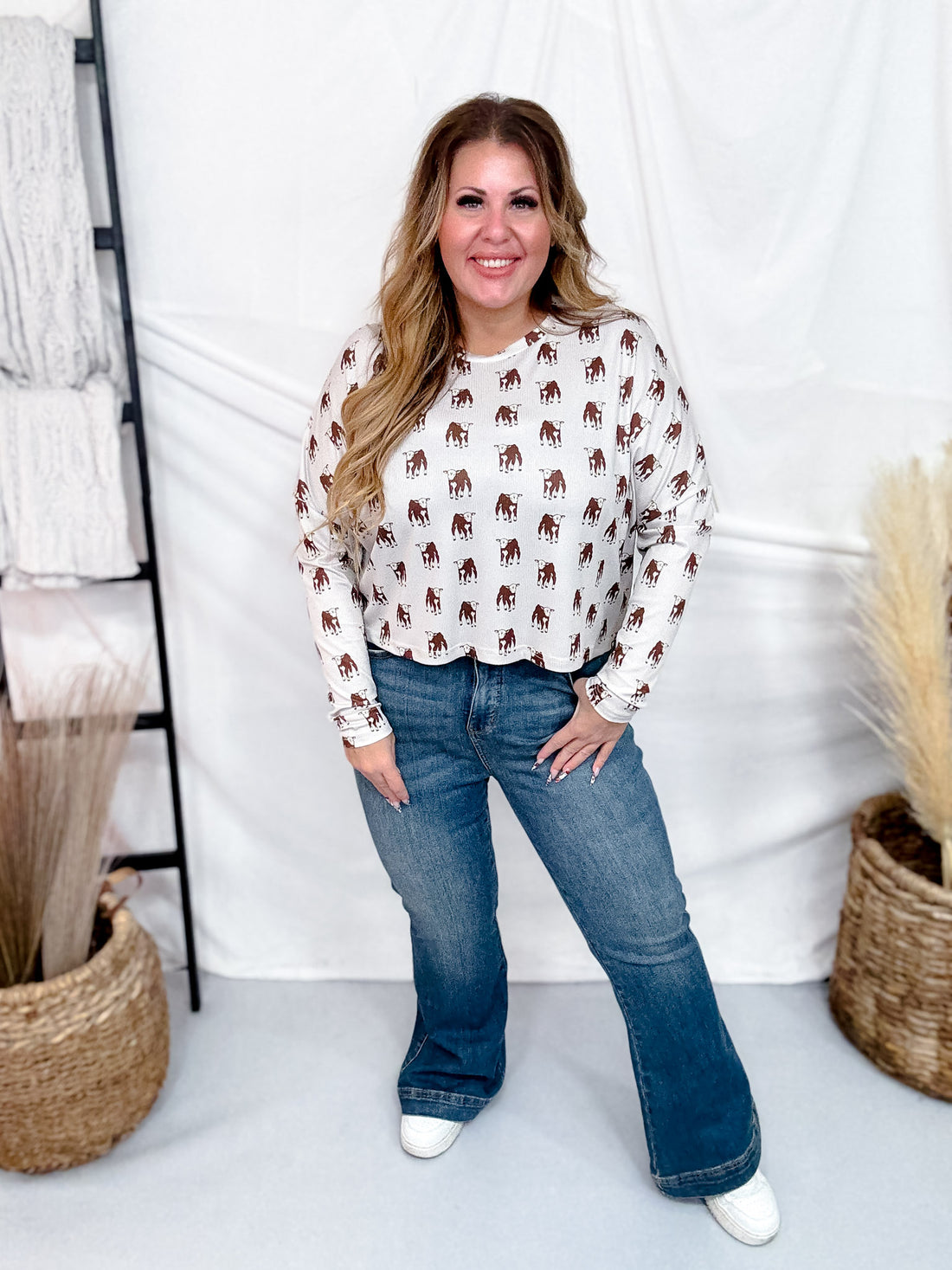 Embrace charm with the slightly ribbed long sleeve midi top, featuring an endearing calf print that's sure to catch eyes and smiles. Its soft texture and flattering fit make it a cozy yet stylish choice for day-to-night wear. Perfect for those who love a quirky twist on everyday fashion, this top pairs effortlessly with your favorite jeans or skirts to brighten up any outfit.