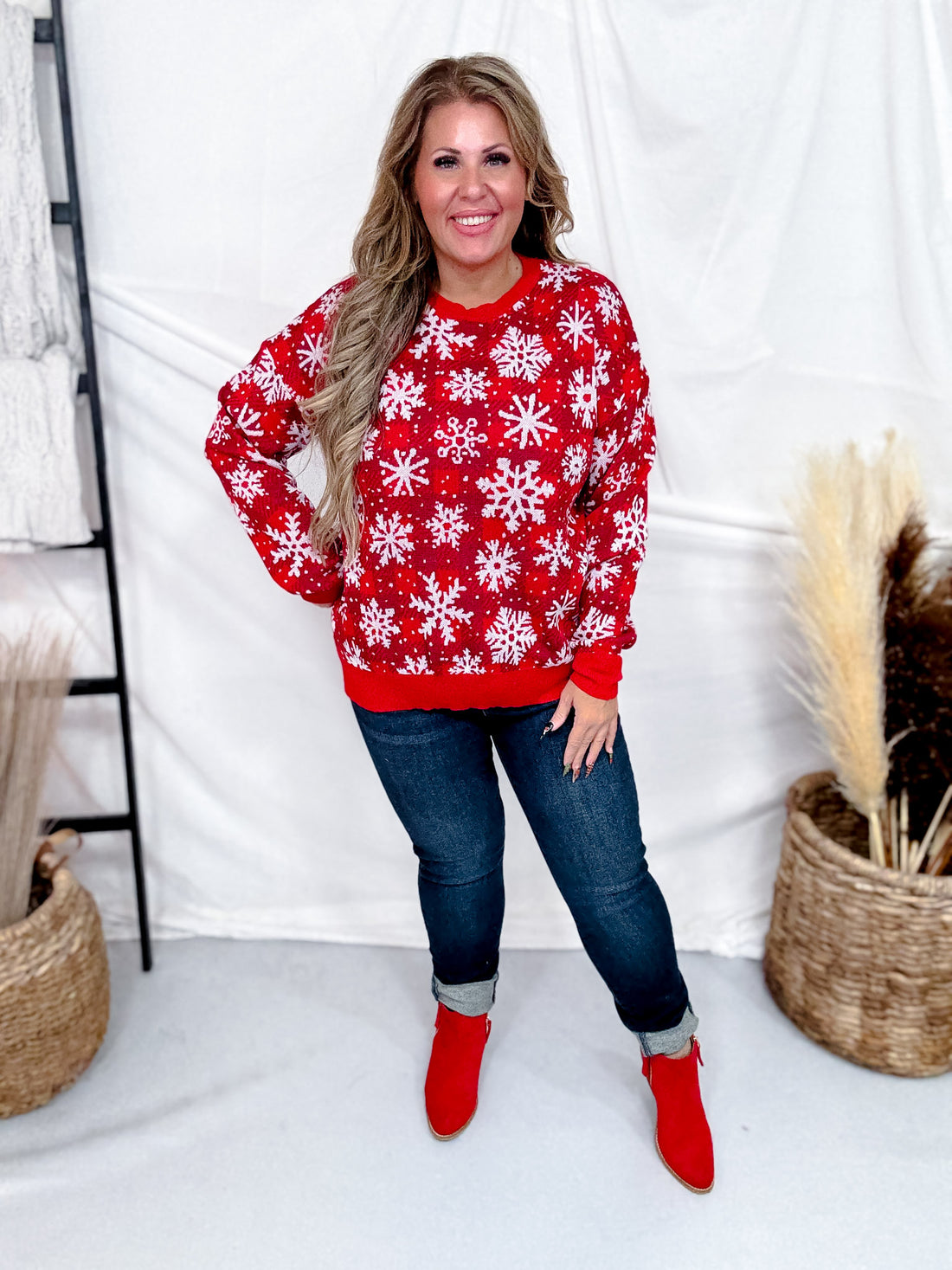 Wrap yourself in winter warmth with this cheerful red sweatshirt featuring a snowflake print. Crafted from cozy knit material, it's the perfect layering piece for chilly days and festive gatherings. Whether you're sipping hot cocoa by the fire or heading out for holiday adventures, this sweatshirt delivers comfort without compromising on style.
