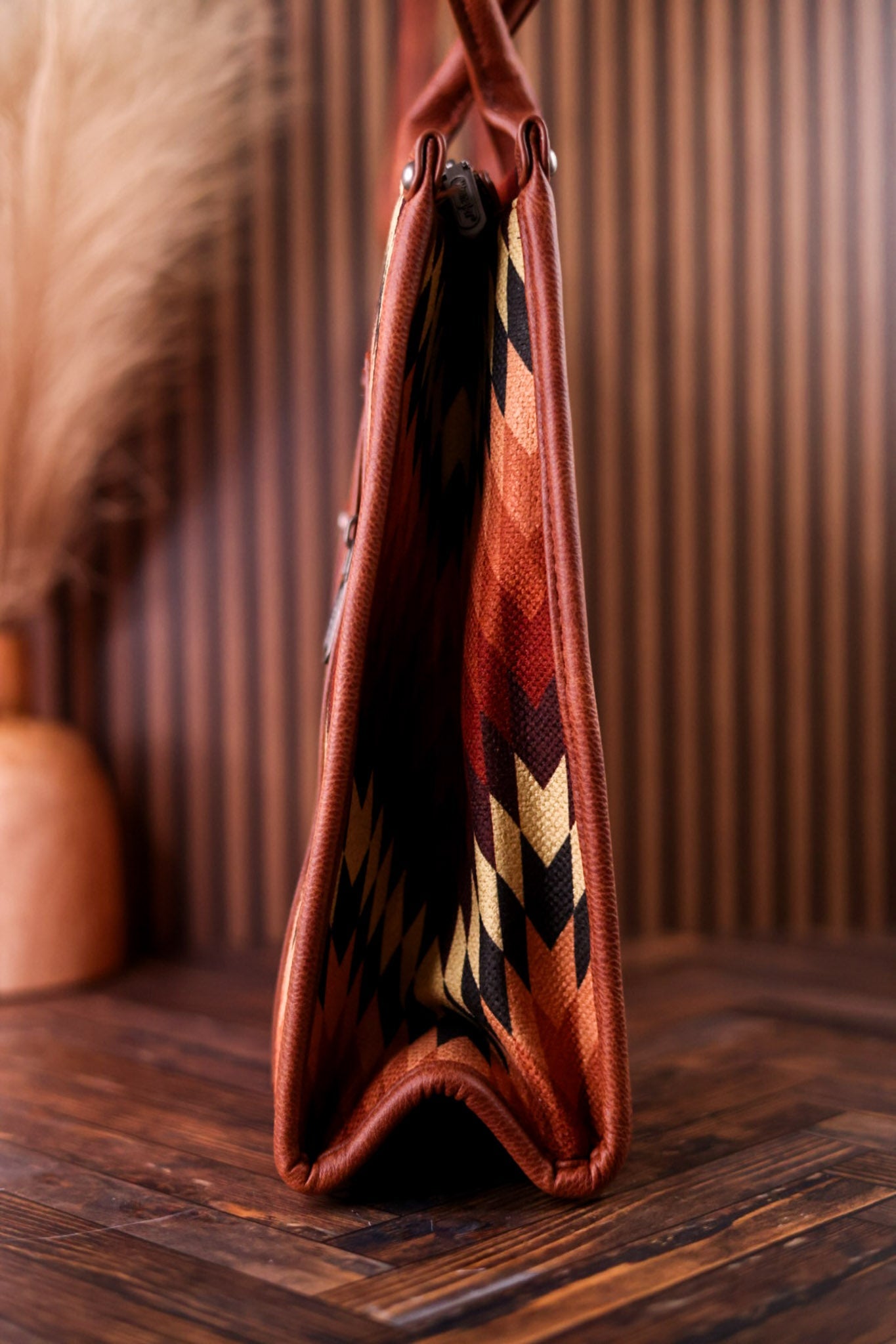 Step out in style and confidence with the Southwestern Patterned Wrangler Concealed Carry Tote Bag. Featuring a warm, earthy southwestern pattern and charming whipstitch vegan leather detailing on the front, this tote keeps your essentials secure without sacrificing flair. Perfect for those who want a playful yet practical blend of fashion and function in their daily carry.