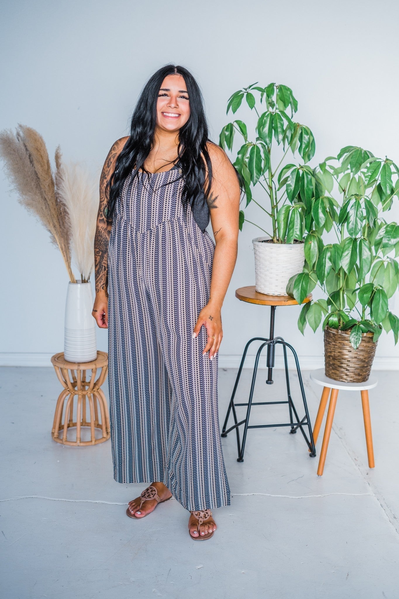 I am obsessed with these overalls! These wide leg tan and navy chevron striped overalls feature a button closure, a v-front yoke bib and the biggest pockets a girl could ever ask for.