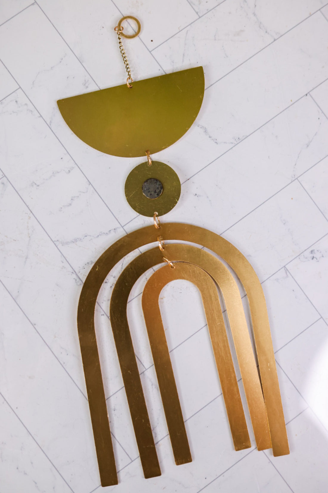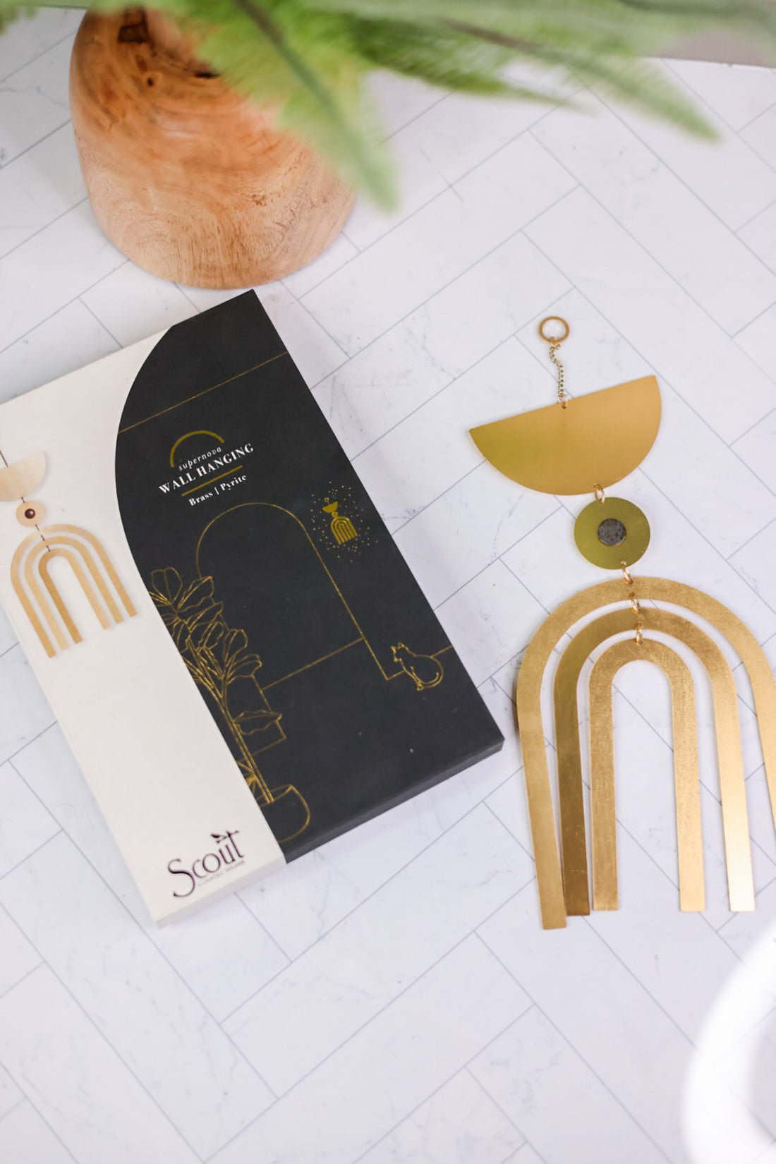Sculptural brass and natural stone combine to create stunning wall art. Comes packed in a beautiful box & muslin bag for gift giving. Includes a metal hook for hanging intended for indoor use only. Pyrite | Stone of Positive Energy Materials: Natural brass, semi precious stone detail, hook for hanging. Dimensions: 11" long x 4.25" wide, Stone: 0.5" X 0.5" Brand: Scout Curated Wears