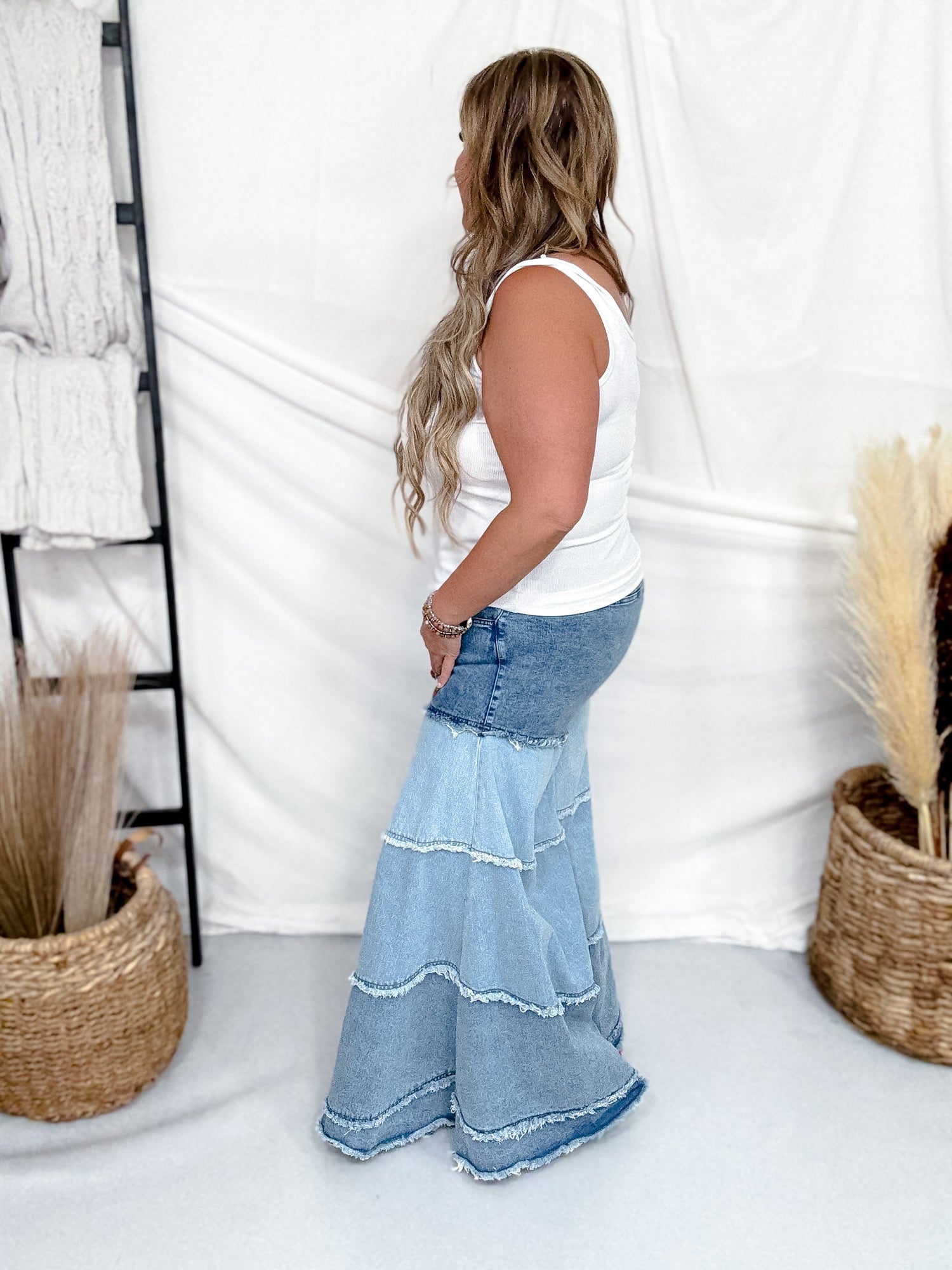 Step up your style game with these playful Tiered Contrast Wide Leg Denim Pants. Featuring a fun tiered design and eye-catching contrast panels, they bring a fresh twist to classic denim. The wide-leg cut offers a breezy, comfortable fit perfect for twirling through your day. Whether you're heading out for brunch or a casual stroll, these pants combine comfort and quirky charm effortlessly.