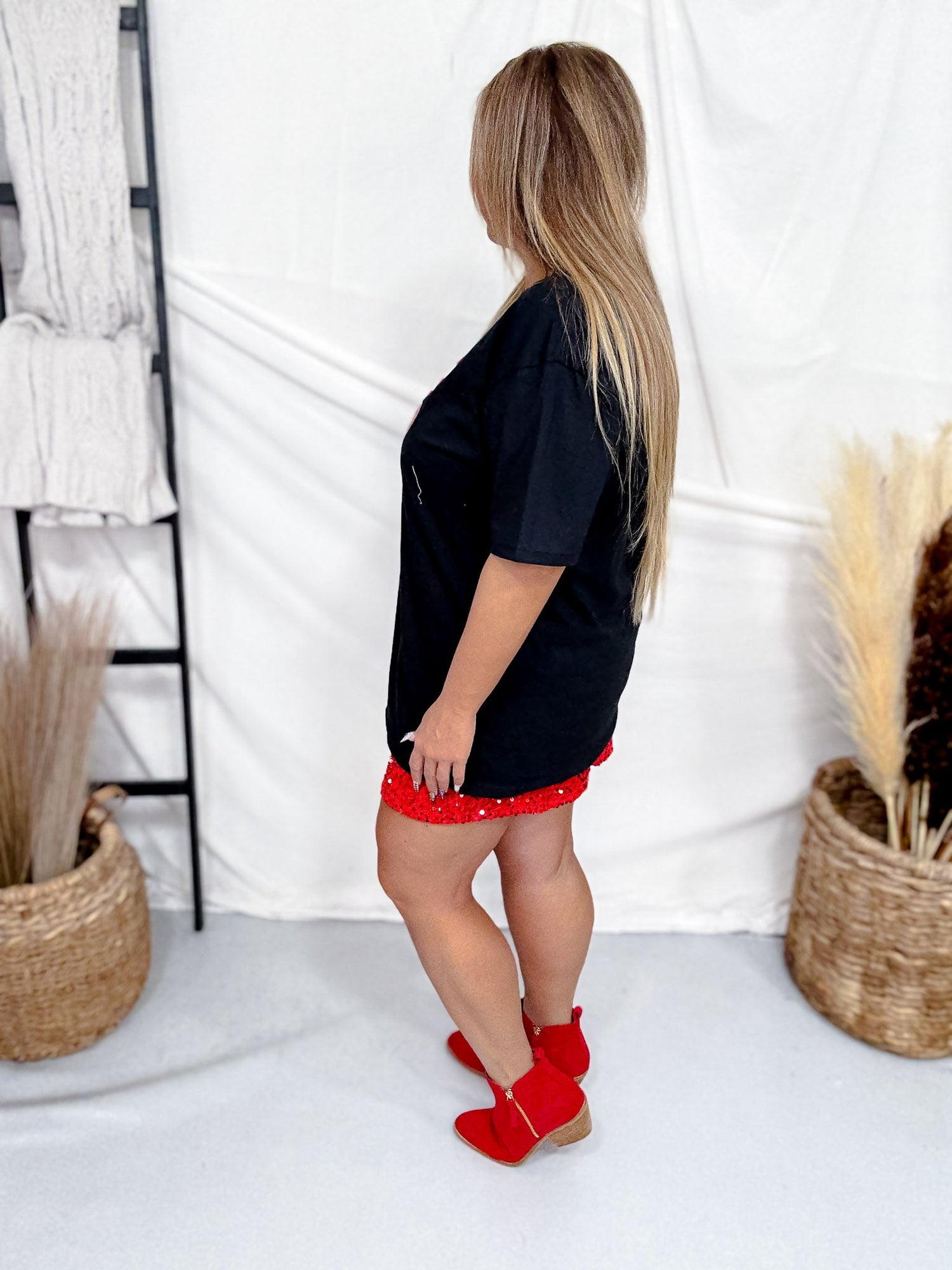 Spread the love this Valentine's Day in this playful black tee featuring a bold red and white checkered heart design with a shimmering sequin heart accent. Perfect for showing off your romantic side with a fun, eye-catching twist.