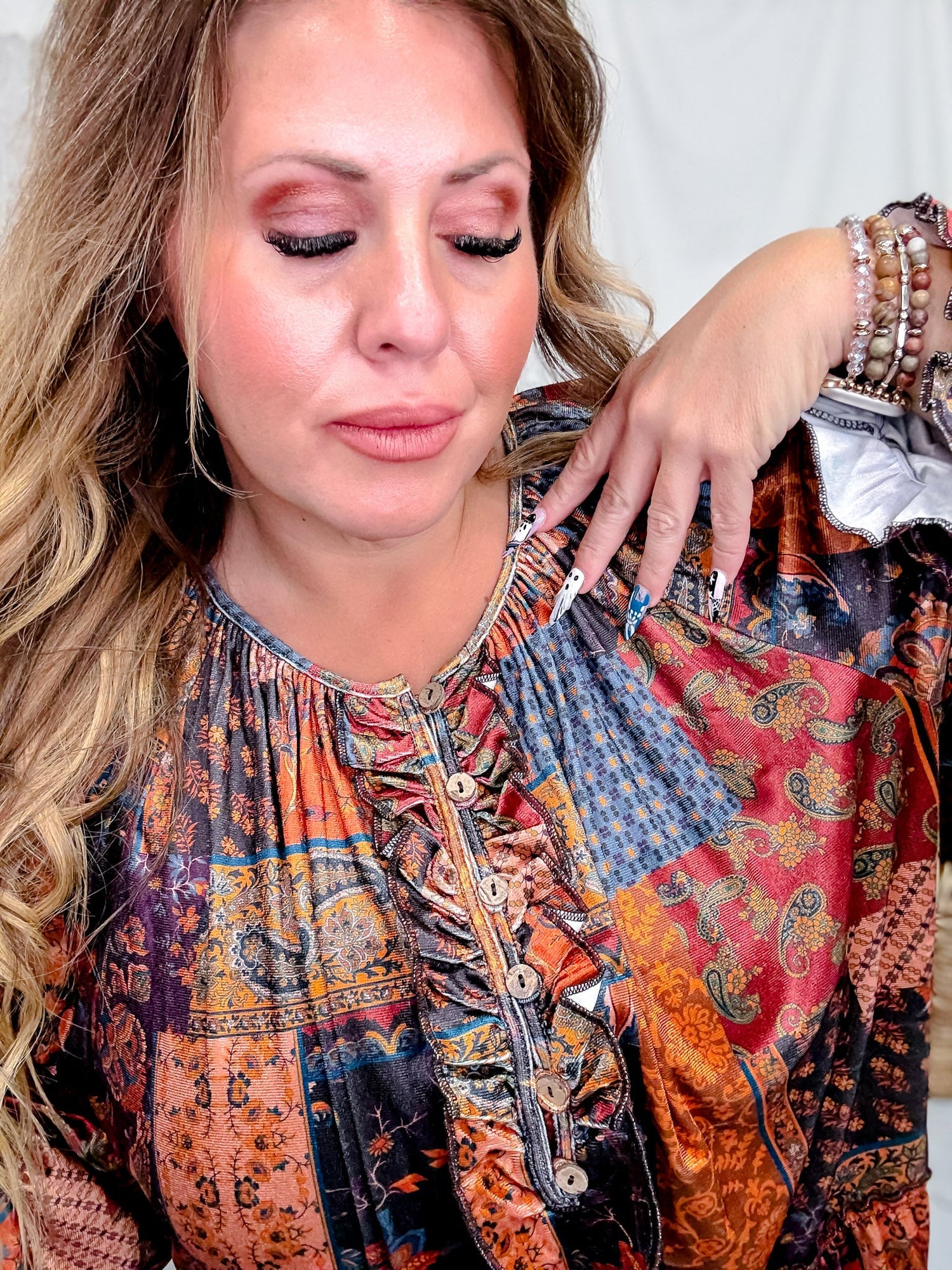 Embrace a playful mix of patterns and colors with this velvet dress featuring a paisley and floral patchwork design. Warm browns and oranges blend effortlessly with rich purples and blues, creating a vibrant, eye-catching look. The ruffled hemline adds a flirty touch, making it perfect for twirling into your next adventure or cozy evening out.